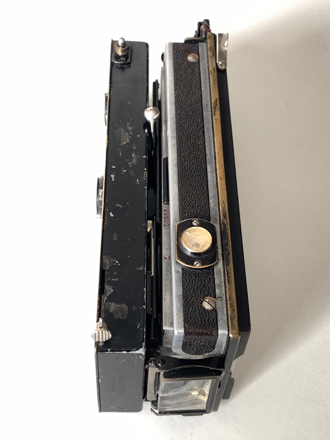 Die ersten Exemplare waren, wie der Katalog 1912/13 zeigt, mit Ikonometer ausgestattet. Das hier gezeigte, etwas spätere Exemplar besitzt einen Newtonsucher. Interessantes konstruktives Detail: Er wird zur Hälfte eingefahren und dann umgelegt – in der Mitte der Linse befindet sich ein Gelenk! Das habe ich in dieser Form noch nicht gesehen. Auch der Diopter ist nicht am Gehäue befestigt, sondern liegt in Ruhestellung um die Linse und wird herausgeschwenkt. Zusätzlich gibt es einen ins Gehäuse eingelassenen Spiegel-/Brillantsucher.
