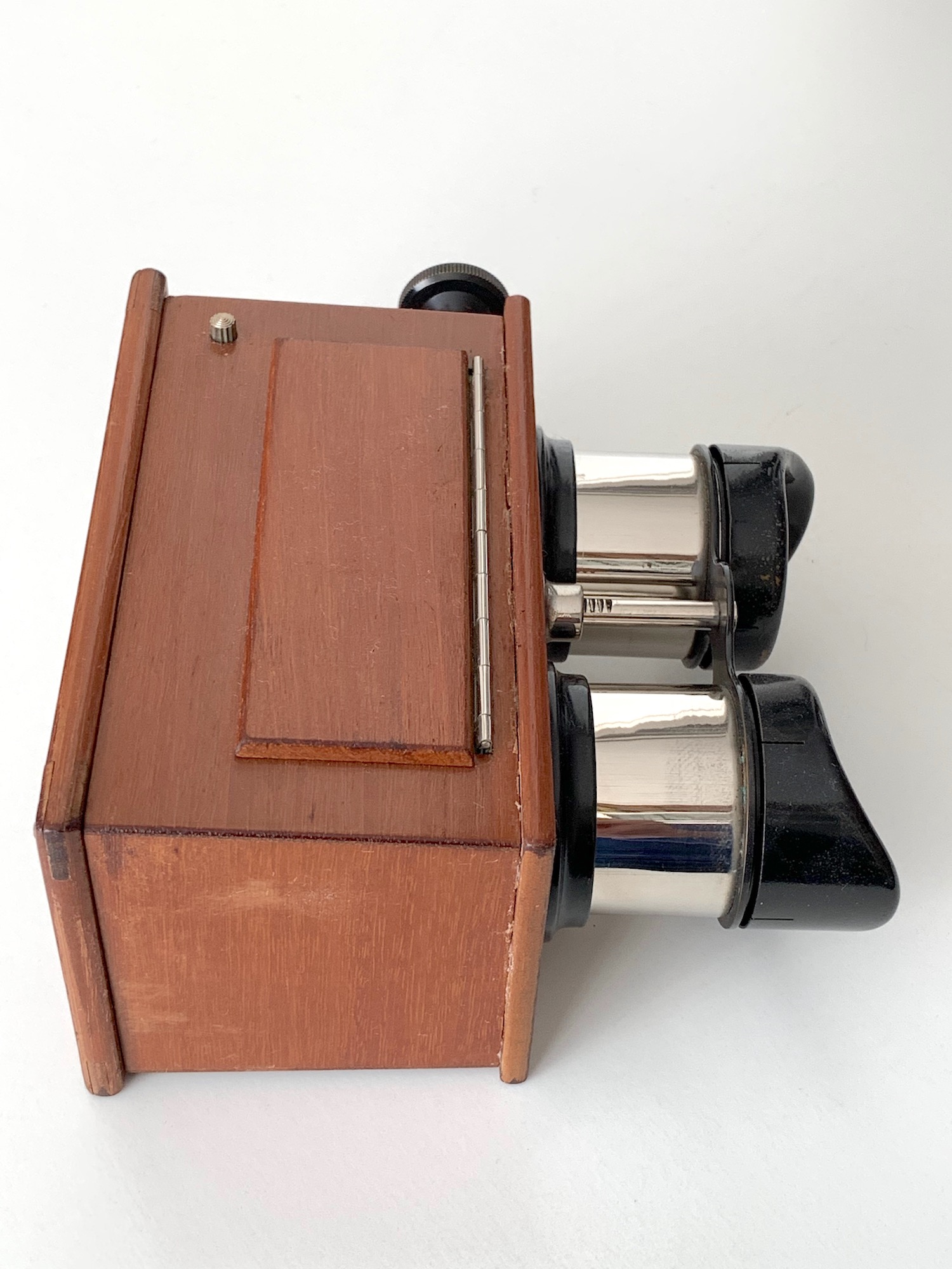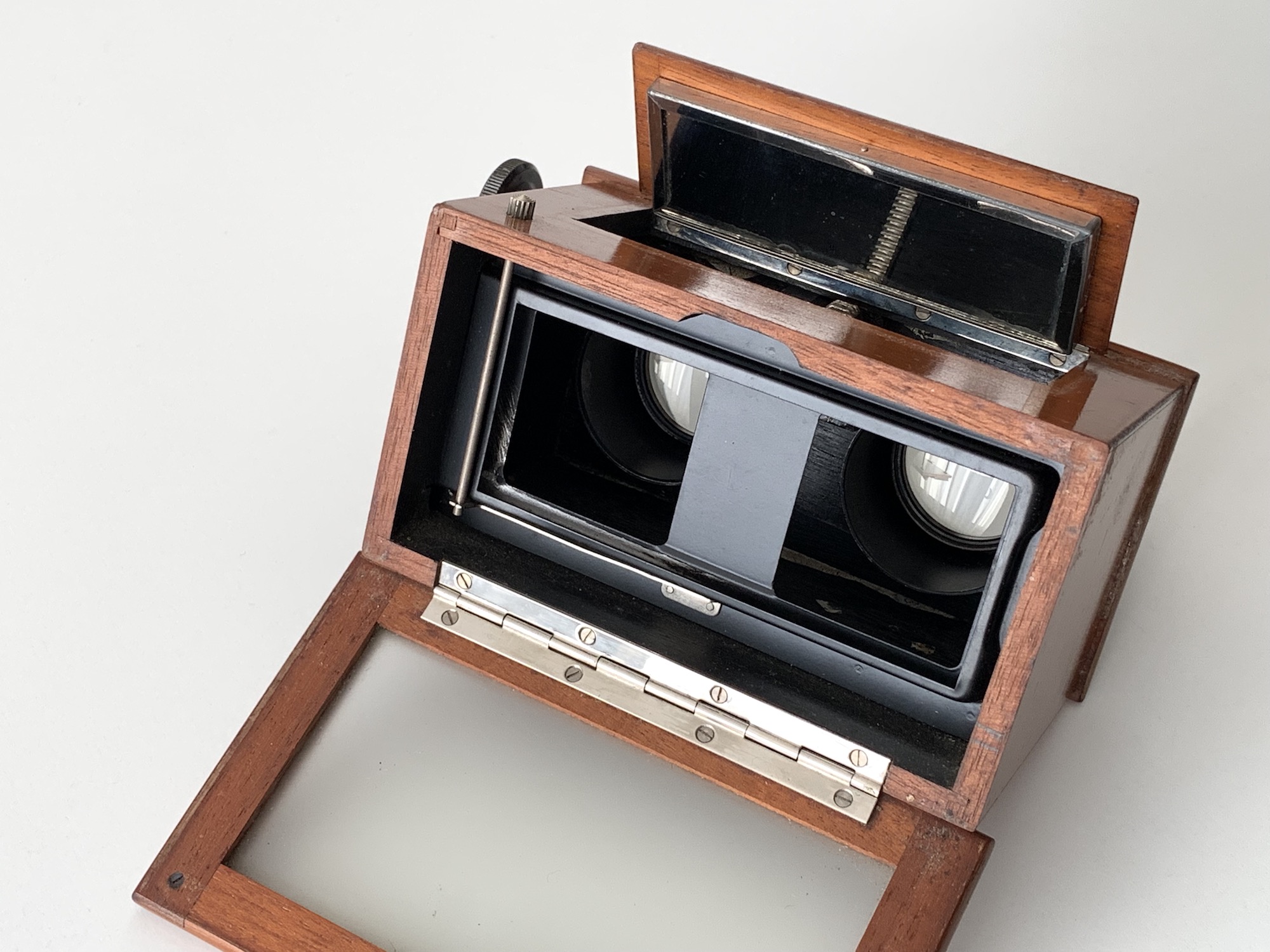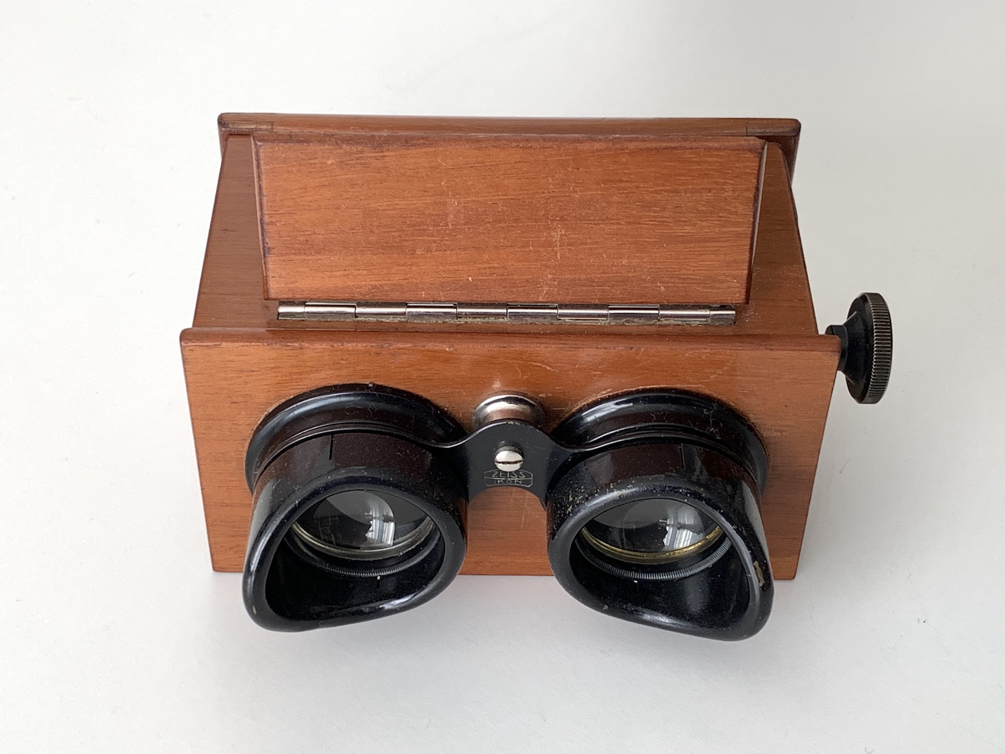 neben Stereokameras, die allesamt aus dem Programm der Vorgängerfirmen übernommen worden waren, bot Zeiss Ikon auch entsprechende Betrachter an. Hier zeige ich das Stereoskop 628/6, einen Handbetrachter im Format 4,5x10,7. Er ist aus poliertem Holz gefertigt und ermöglicht sowohl die Betrachtung von Durchsichtsbildern als auch von Papierbildern; dazu kann eine Klappe mit einem Spiegel hochgeklappt werden, der das Licht refektiert. Die Fokussierung erfolgt über einen präzisen Spindeltrieb. Die Augenmuscheln lassen sich abnehmen. Das Gerät wurde im Jahr 1926 für 33 RM verkauft. Es gab auch Varianten ohne Spiegel sowie im größeren Format 6x13.