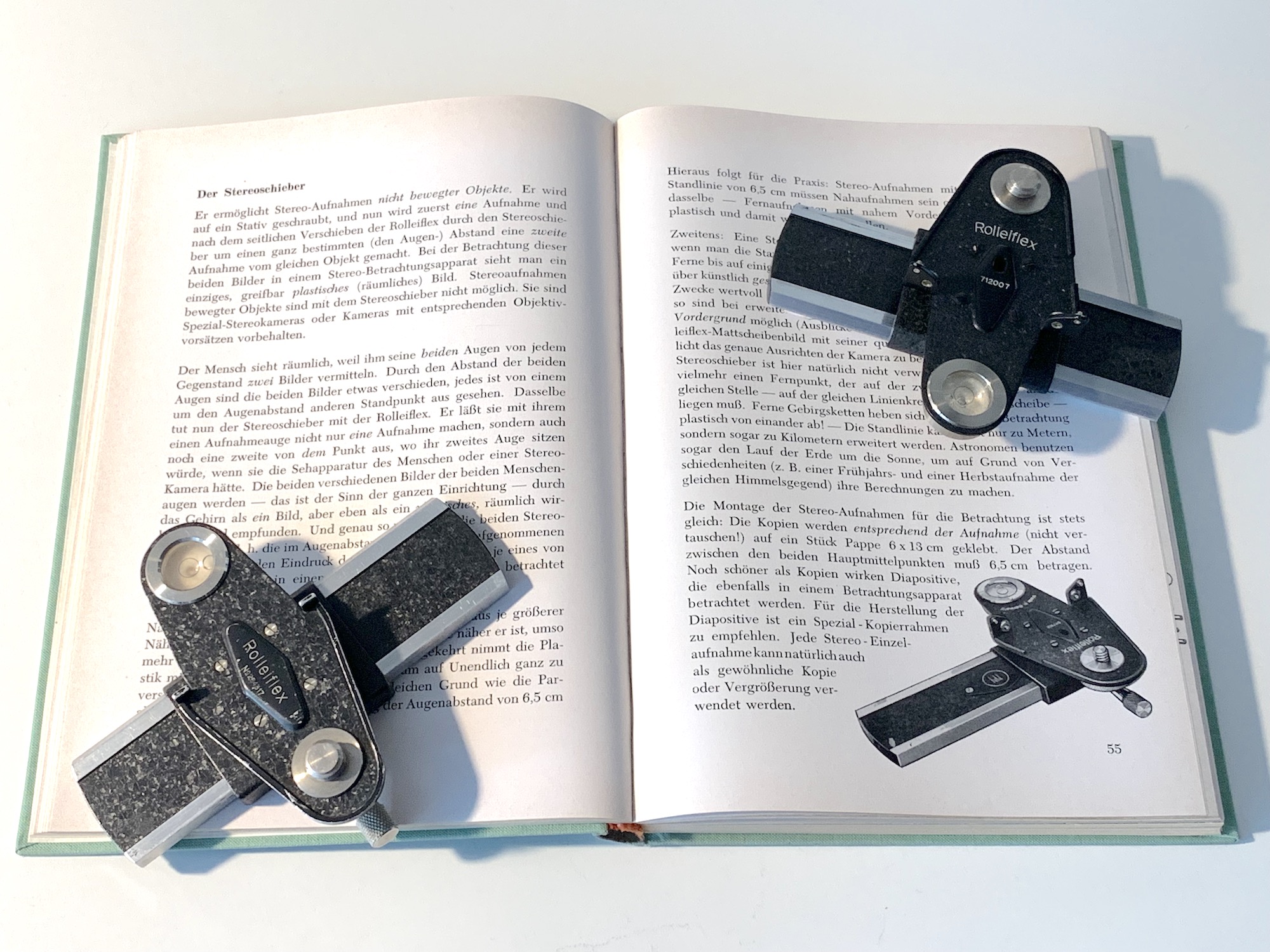 Der Stereoschieber wurde mit gewissen Modifikationen im Zeitraum 1933–1954 gebaut. Er passt an Rollei-Kameras der Formate 6x6 und 4x4. Links sieht man ein frühes Modell, erkennbar an den kleinen Anschlägen für die Kamerafront, die noch keine Buchsen für die mechanische Fixierung der Kamera tragen; rechts die letzte Ausführung. (Seit Mitte der 30er Jahre besitzen Rollei-Kameras an der Vorderseite kleine Passstifte, die in die betr. Buchsen dieses und anderer Zubehörteile eingreifen und ein Verschieben verhindern.) – Im Hintergrund die entsprechende Darstellung im Rolleiflex-Buch von Walther Heering, Auflage 1952).