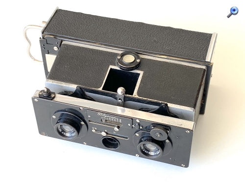 Es handelt sich um eine Stereokamera im Format 4,5x10,7, eingerichtet für Platten. Sie besitzt ein starres Gehäuse. Die Entfernung wird über einen mit einem Hebel gesteuerten Schneckengang eingestellt; die Objektive sind mittels Koppelstange hinter dem Objektivbrett miteinander verbunden.