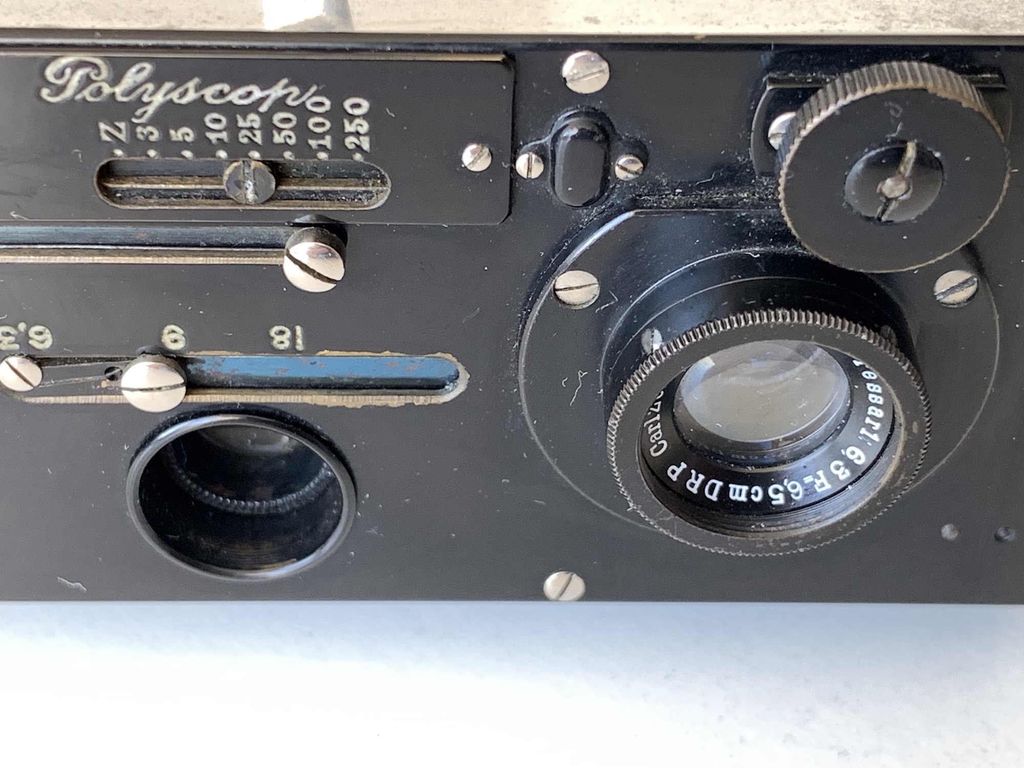 Das Objektivbrett ist nicht verstellbar. (Es gab zwei Schwestermodelle – das Mod. 605 besitzt keine Entferungseinstellung, das Mod. 607 entspricht dem Polyscop 606, verfügt aber zusätzlich über ein vertikal verstellbares Objektivbrett.) Wie schon bei den Zulauf-Kameras ist ein recht einfacher Guillotine-Verschluss eingebaut, der den Zeitenbereich 1/3–1/250 umfasst. Die Zeiten werden mit dem Drehrad oben rechts (von vorn gesehen) eingestellt und können auf der waagerechen Skala abgelesen werden. Der Spannhebel sitzt darunter, er wird seitlich bewegt. Die Kamera besitzt die drei Lochblenden 6,3, 9 und 18, die über einen Schieber eingestellt werden.