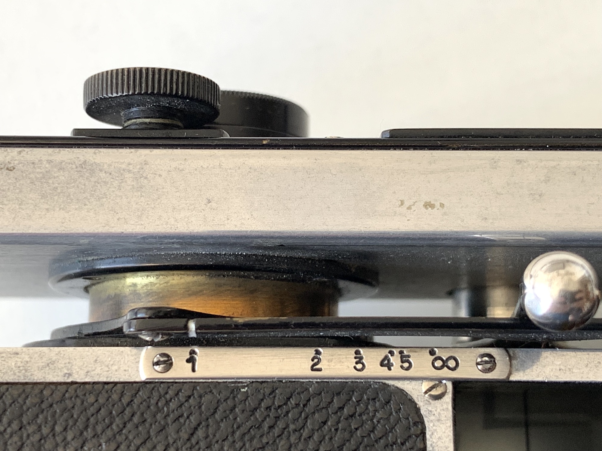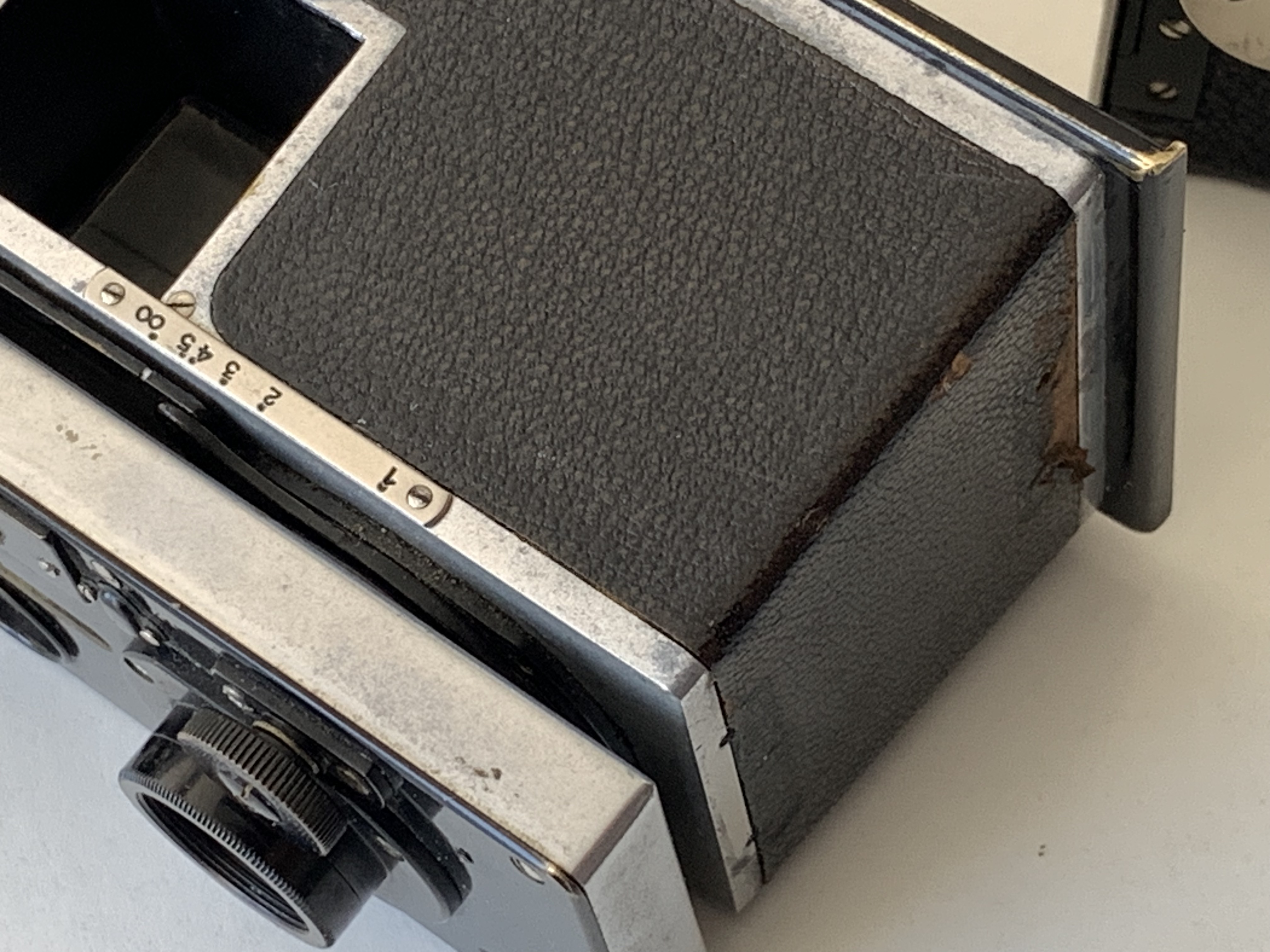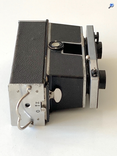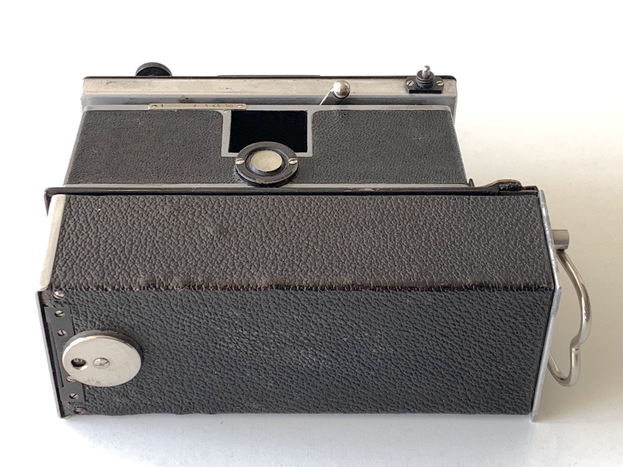 Für die Bildbetrachtung ist ein Spiegelsucher eingebaut, außerdem war für Aufnahmen aus Augenhöhe ein seitlicher Newtonsucher vorgesehen, der beim gezeigten Exemplar allerdings fehlt. Auf der Oberseite des Gehäuses befindet sich eine Libelle.