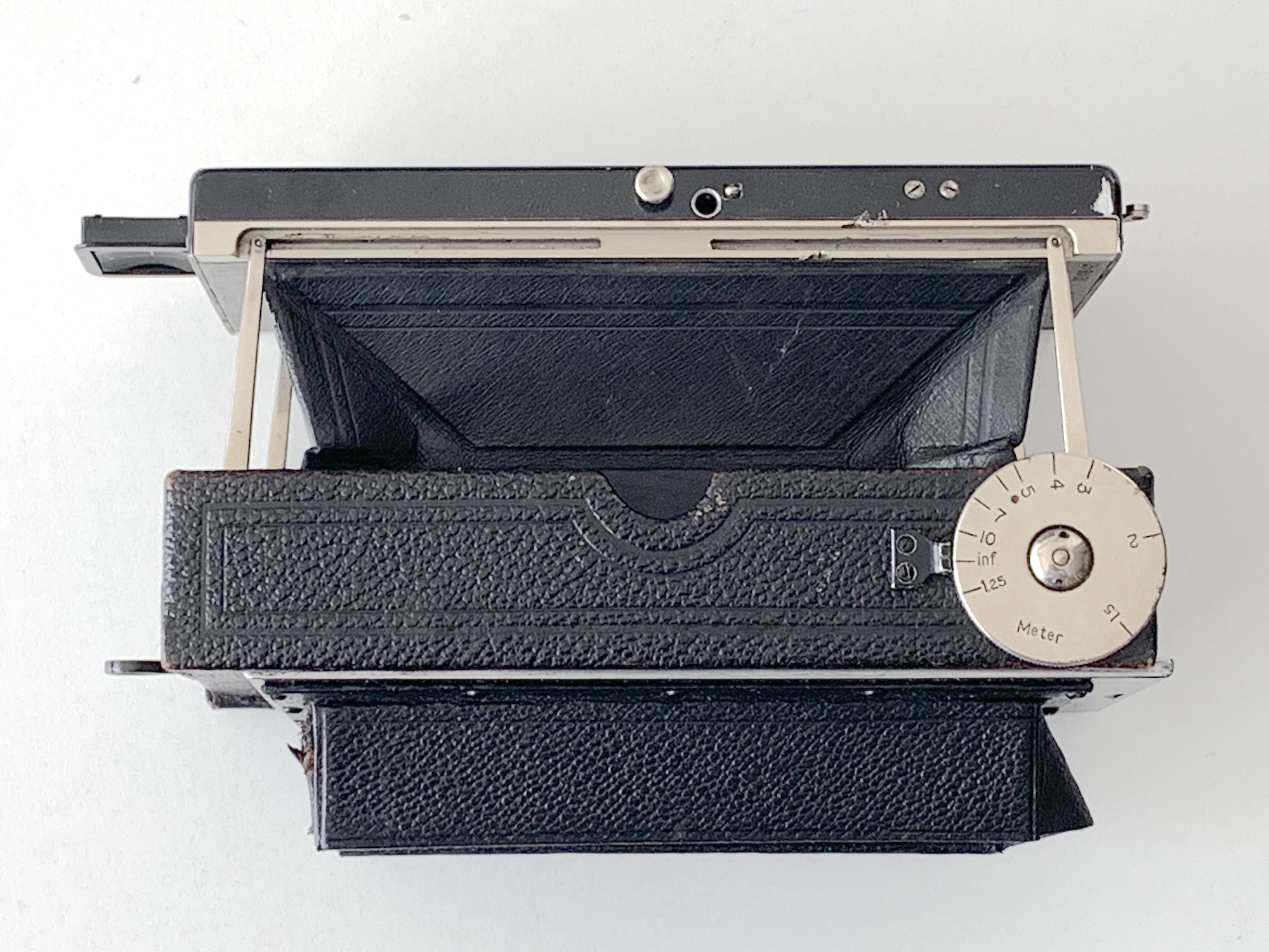 Das Vorderteil lässt sich mittels Knopfdruck entriegeln und nach vorn ziehen, sodass die Kamera schnell in Aufnahmebereitschaft ist. Die Kamera besitzt nur einen Balgen; die Strahlengänge sind durch eine Zwischenwand getrennt. Die Fokussierung erfolgt über ein Drehrad auf der Oberseite, das auf den Rahmen wirkt, an dem die Spreizen befestigt sind. Naheinstellung ist bis 1,25 m möglich. Mein Exemplar ist mit einem überbauten Compound mit dem Zeitenbereich 1–1/150 ausgestattet. Blende und Zeit werden über die beiden Drehräder eingestellt. Verbaut sind zwei Goerz Syntore (Vierlinser) 6,3/60 mm. Das war die einfachste Ausstattung; die Kamera gab es auch mit Dogmar, Celor oder Dagor; spätere Exemplare besaßen Compur-Verschlüsse bis 1/250. Der Newtonsucher mit Fadenkreuz liegt eingeklappt in einer Mulde, wenn er nicht gebraucht wird. Eine schöne, sauber konstruierte und gut verarbeitete Kamera.