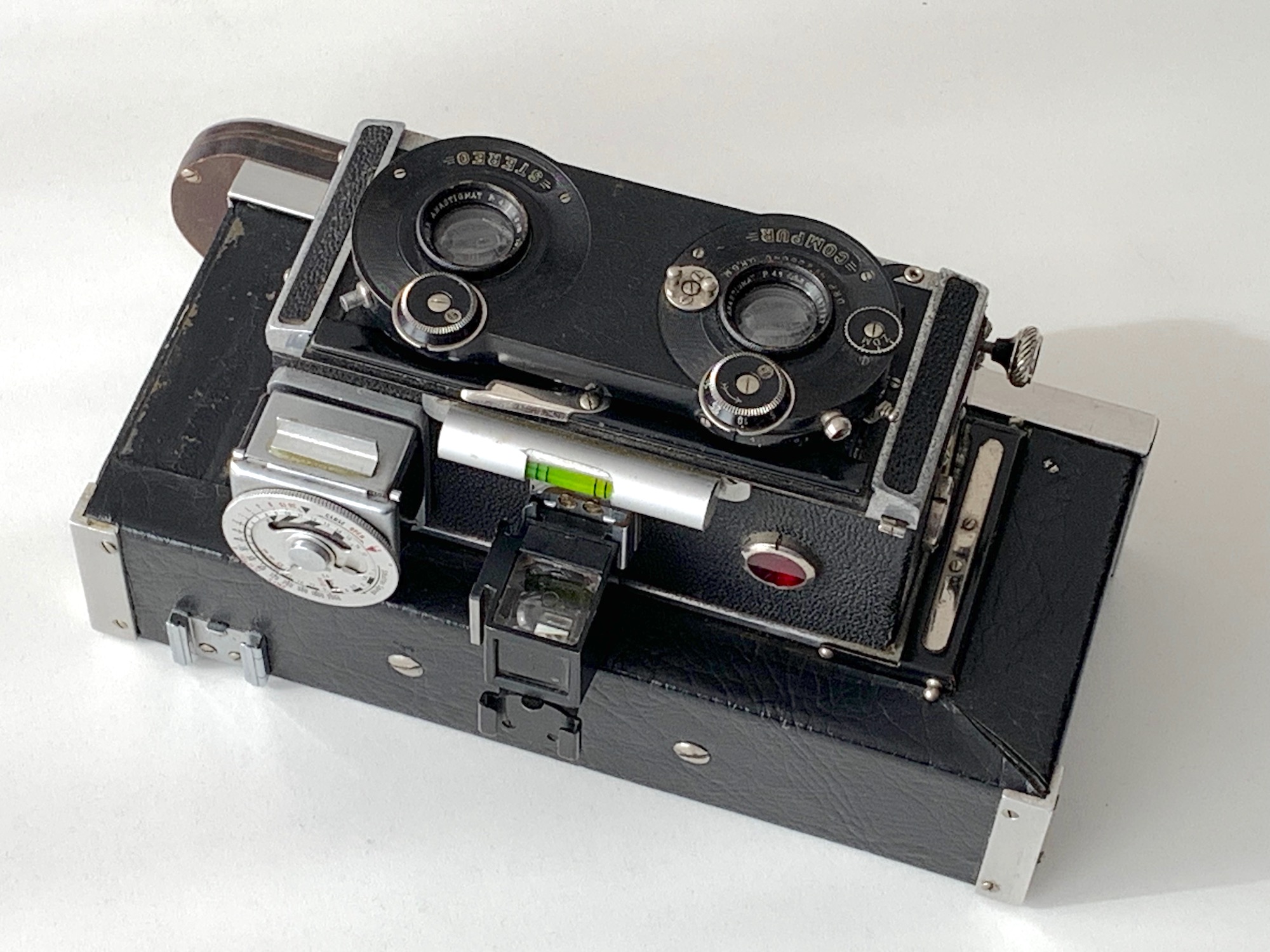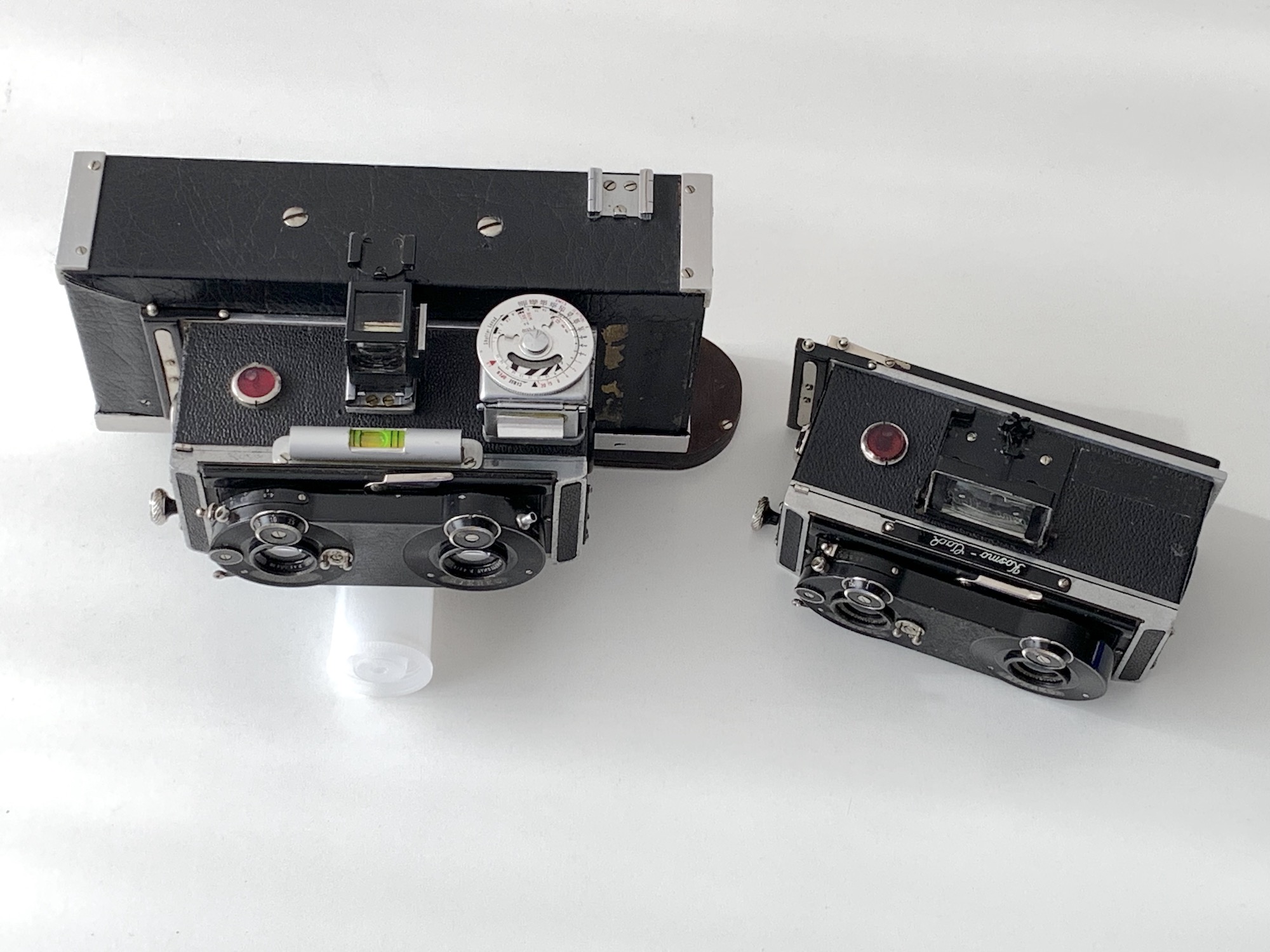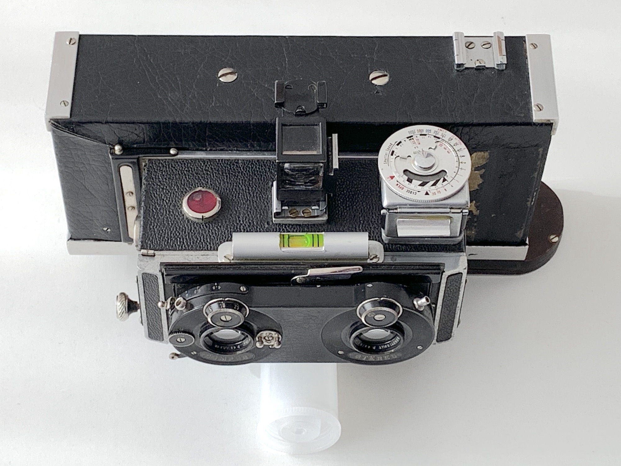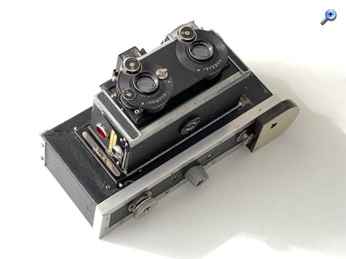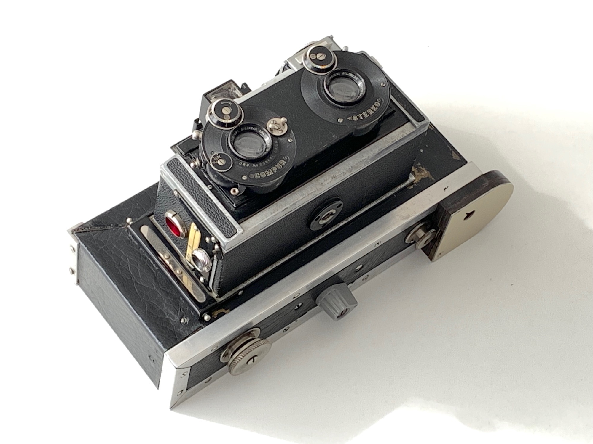 ein Segment meiner Sammlung bilden seit einiger Zeit Stereokameras für Platten 4,5x10,7 und 6x13. Leider kann ich sie bislang nicht nutzen, da ich kein Rollfilm-Magazin besitze. Vor diesem Hintergrund ist ein Neuzugang von besonderem Interesse, der
