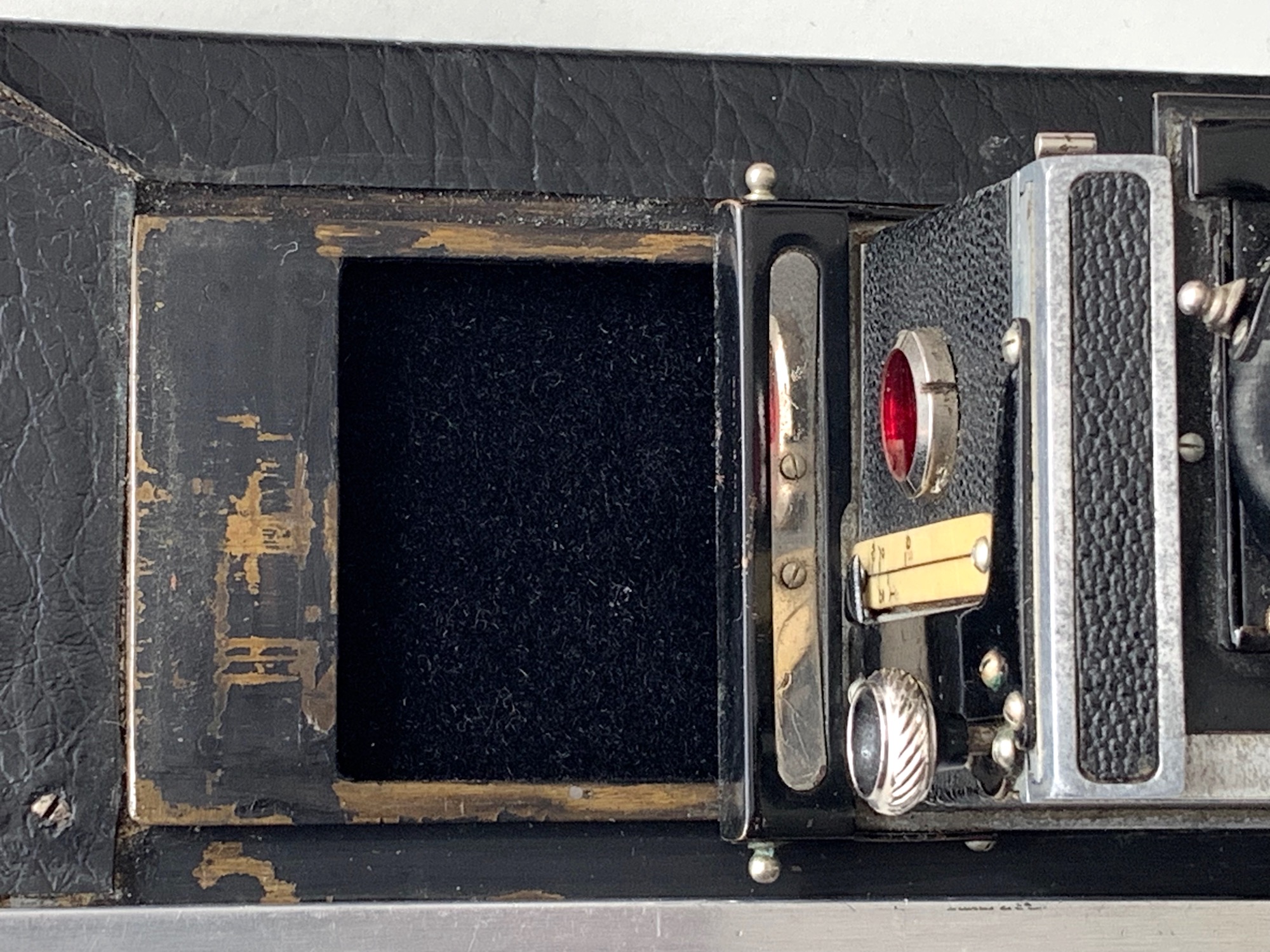 Auf diese Weise sollte die Kamera nutzbar gemacht werden. Dazu bedurfte es eines Filmmagazins, und das stellt die eigentliche Besonderheit dieses Exponats dar. Zunächst fällt die Größe auf – es ist für 120er Rollfilm vorgesehen; es bleibt natürlich beim Aufnahmeformat 4,5x10,7. Aber 120er Rollfilme waren und sind leichter zu bekommen als 127er. Die Ausführung des Magazins ist funktional, stabil, in mancherlei Hinsicht auch raffiniert und aiufwendig; manches, vor allem die Metallkonstruktion im Innern, wirkt recht 'grobschlächtig'.
