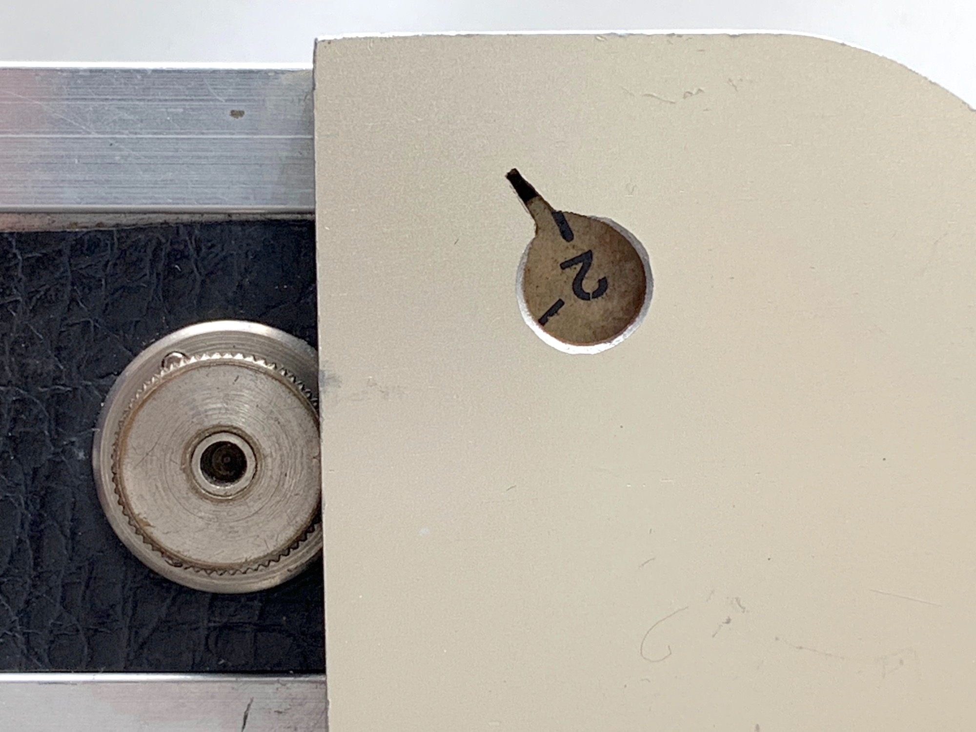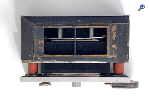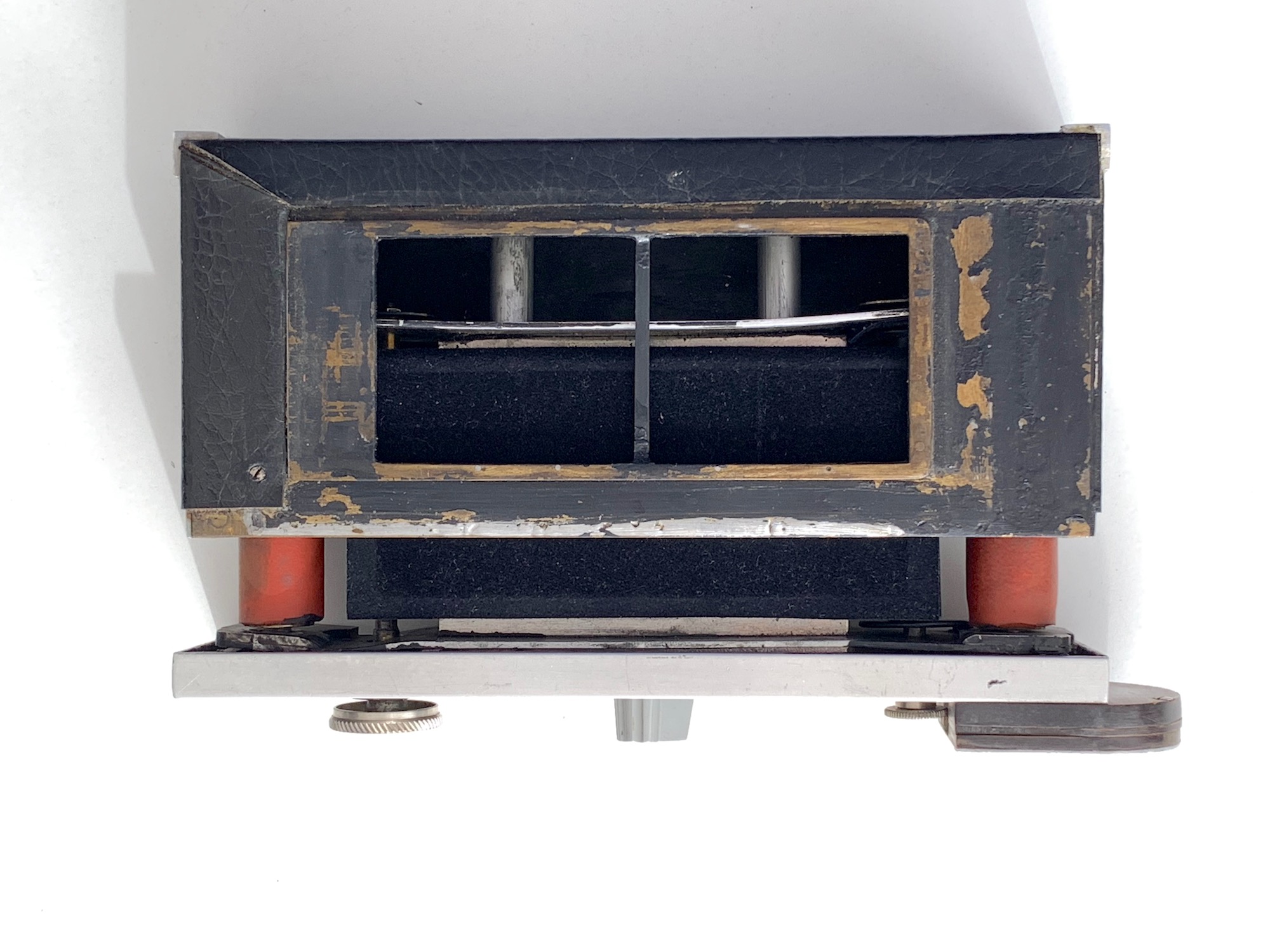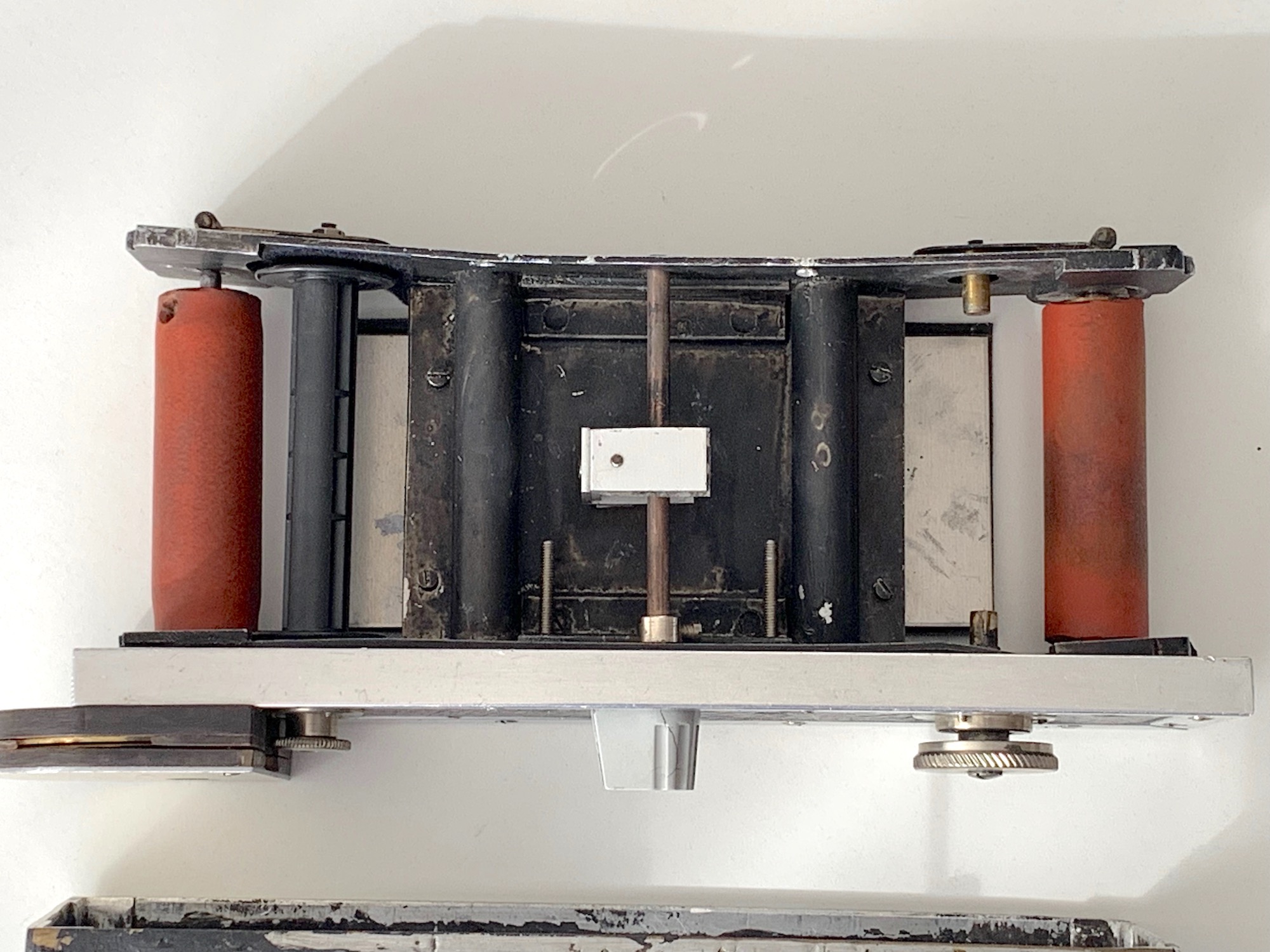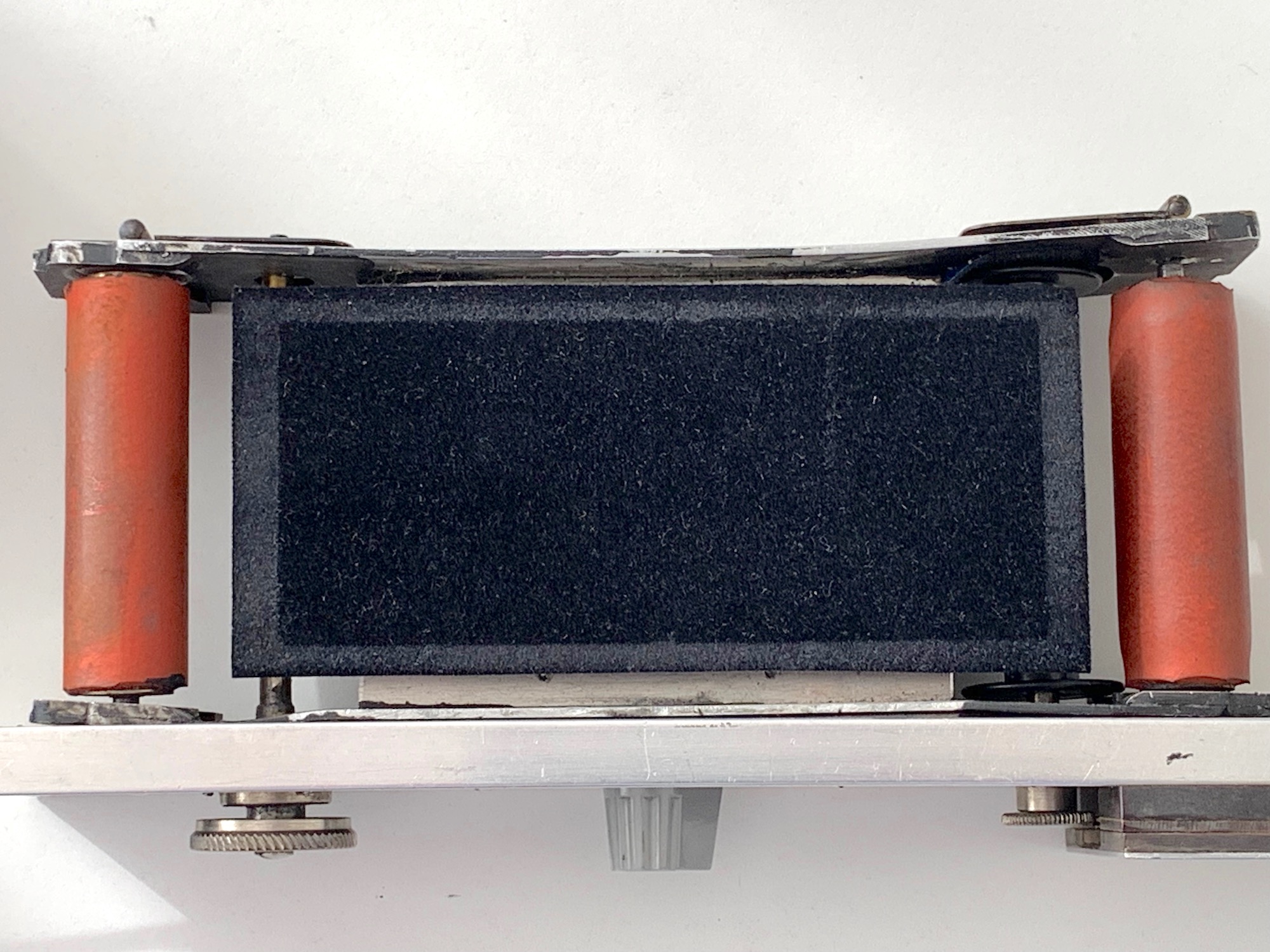 Erkennbar sind die Knöpfe für die Filmspulen. Der Film läuft über die dicken roten Rollen; eine davon ist mit einem Bildzählwerk gekoppelt. Die Andruckplatte wird mit dem Drehknopf auf der Unterseite, der auf eine Exzenterscheibe wirkt, Position gebracht und sorgt (hoffentlich) für gute Filmplanlage. Mechanisch scheint alles zu funktionieren.