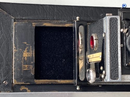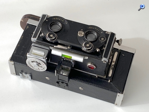 Zunächst zur Kamera: Fokussiert wird mittels Balgenauszug über den kleinen Triebknopf rechts. Die Verschlusseinheit ist abnehmbar, an ihrer Stelle kann ein Vorsatz zum Betrachten von Stereobildern eingesetzt werden. Die Kamera ist also eine Art Multifunktionsgerät. Das gilt auch für das Aufnahmeformat: Die Frontplatte lässt sich zur Seite schieben, sodass das linke Objektiv in der Mitte des Bildfensters liegt. Es sind dann Panoramaaufnahmen 4,5x10,7 möglich; die Zwischenwand zwischen den Bildfenstern wird dann automatisch zur Seite geschwenkt (was bei diesem Exemplar nicht mehr funktioniert). Das Objektivbrett ist vertikal verstellbar. Eingebaut sind zwei Solineare 4,5/6,5 cm in Stereo-Compur 1–1/250.