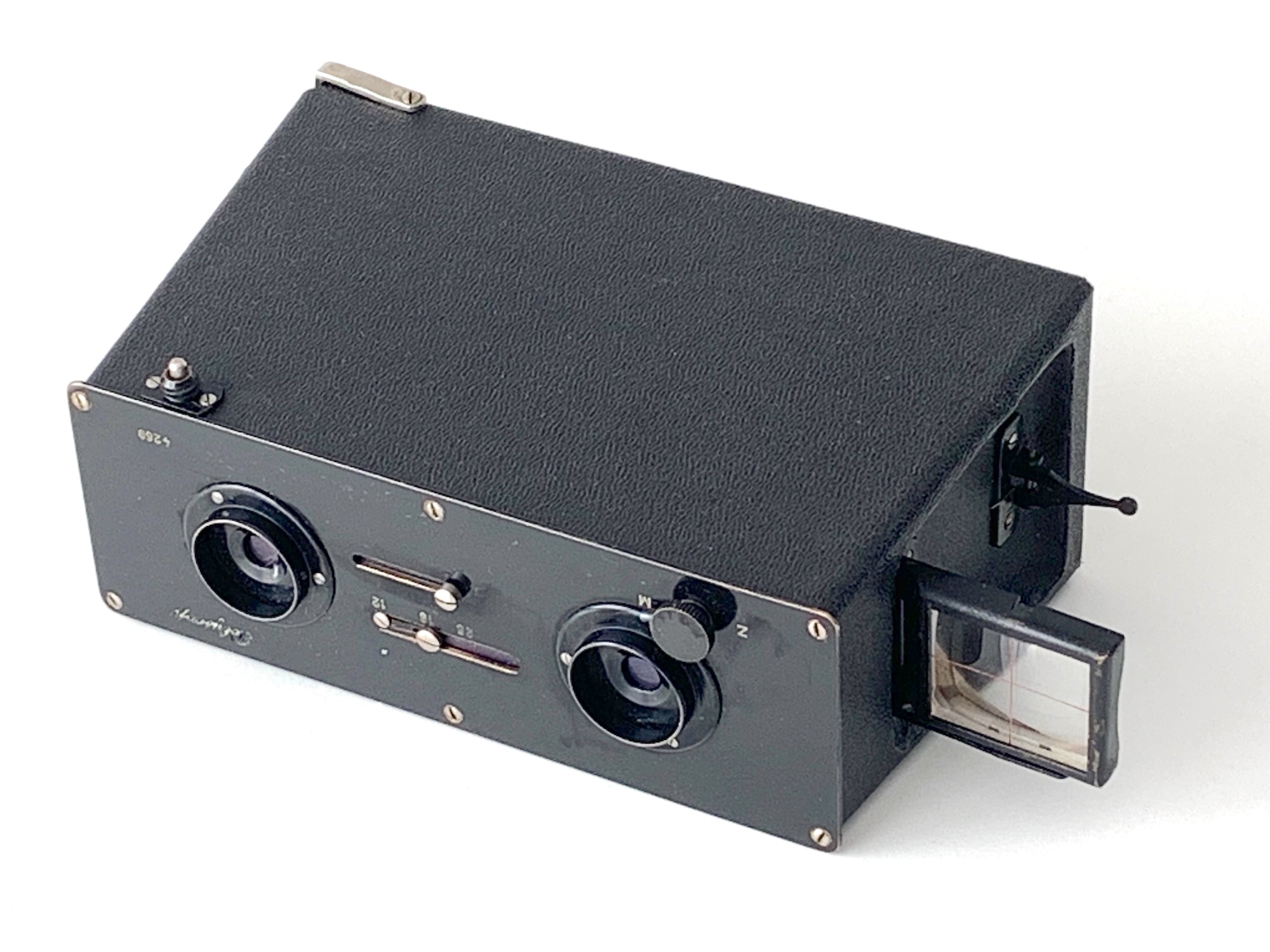Es handelt sich um eine sehr einfache Stereokamera in Kastenbauweise (leicht konisch zulaufende Jumelle-Form) für Platten 4,5x10,7. Die Kamera besitzt einen simplen Guillotine-Verschluss mit einer Momentzeit (ca. 1/25) und Z; verbaut sind zwei Achromate mit der Brennweite 12/6,5 cm. Eine Naheinstellung ist nicht vorgesehen; die Belichtung kann mittels Lochblende (Werte 12, 18, 25) variiert werden. Als Sucher fungiert ein abklappbarer Newtonsucher; auch eine Mattscheibe kann anstelle eine Kassette eingeschoben werden. Der Auslöser verfügt über einen Kranz mit Außengewinde, über das ein Drahtauslöser montiert werden kann. Die Kamera besitzt ein Metallgehäuse und ist mit 485 g überraschend schwer.