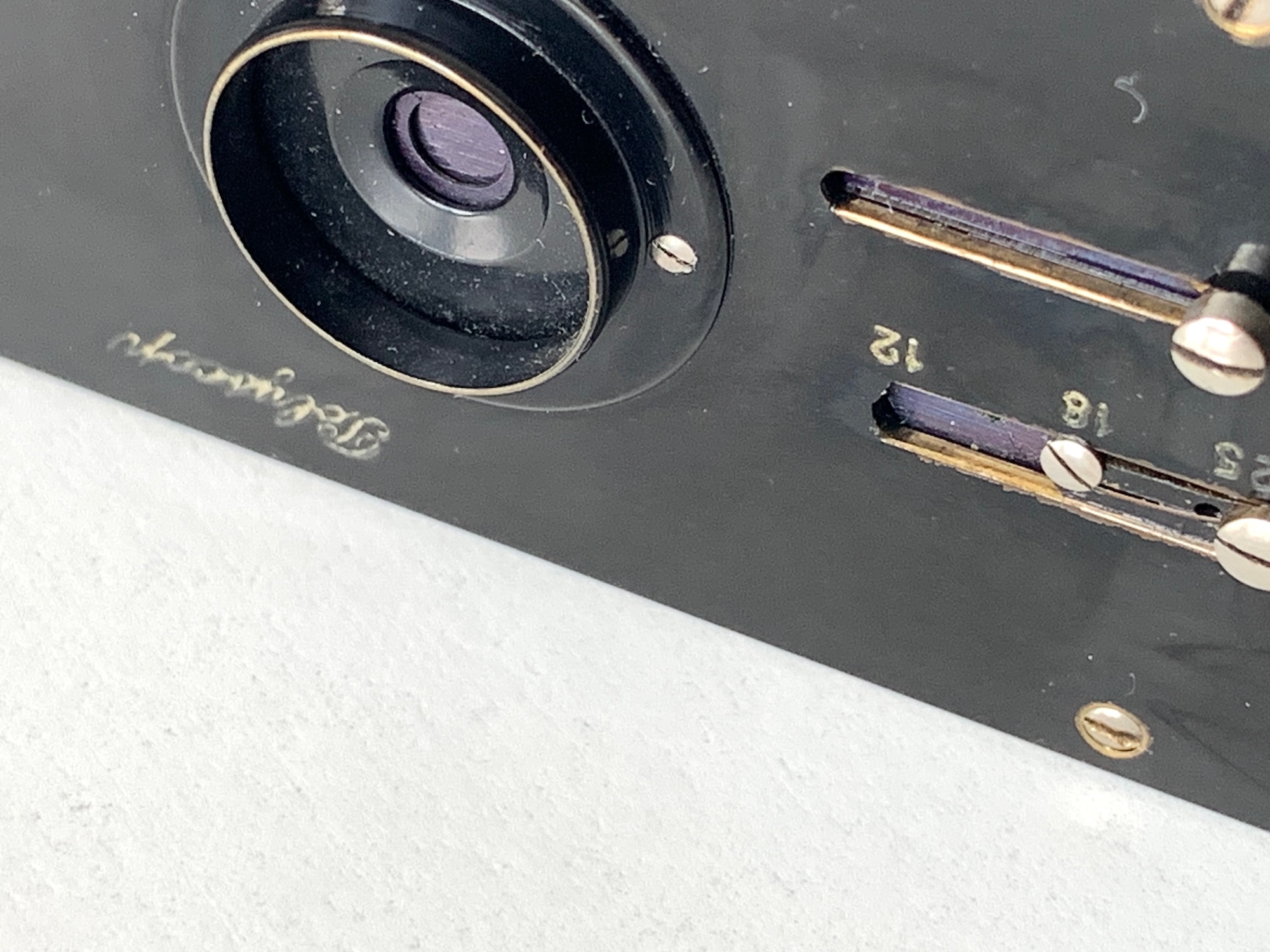 Bemerkenswert die Position der Schrift: Wenn sich die Kamera in Fotografierhaltung befindet (Stativaufnahme unten, Auslöser oben), steht die Beschriftung auf dem Kopf…