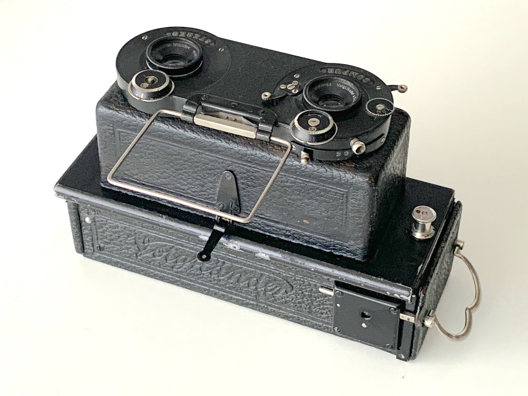 neben dem bekannten Stereflektoskop, einer Spiegelreflex-Stereokamera (--> https://blende-und-zeit.sirutor-und-comp...5&thread=24), bot Voigtländer seit 1921 auch ein einfacher ausgestattetes Modell einer Stereokamera mit starrem Gehäuse an, das Stereofotoskop. Im Katalog 1926 heißt es zu dieser „Stereo-Kleinkamera“ für das Format 4,5x10,7: „Diese Kamera zeichnet sich vor allem durch einfache Handhabung und leichtes Gewicht (Modell III wiegt nur 310 g) aus.“