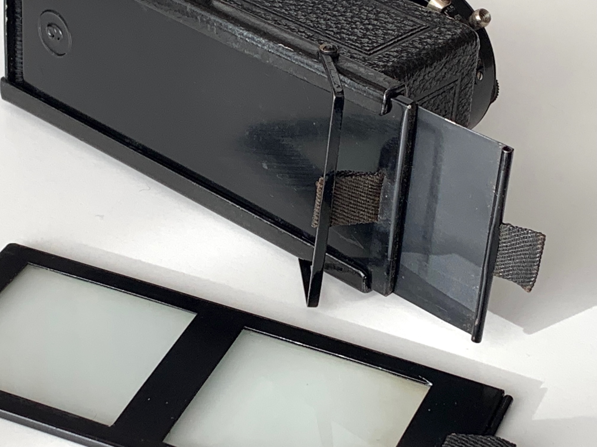 oben habe ich das Modell II des Stereofotoskops erwähnt. Es unterscheidet sich vom Modell I nur durch den Falz: Die Kamera nimmt ausschließlich Einzelkassetten oder eine Mattscheibenkassette auf; der Anschluss des Wechselmagazins ist nicht möglich. Damit ist ein gewisser Gewichtsvorteil verbunden, und die Mattscheibe (die bei Mod. I nur mittels Adapter angeschlossen werden kann) erlaubt eine genauere Motivbeobachtung. Modell II wurde für 180 RM angeboten; im Lieferumfang waren 6 Einzelkassetten enthalten. Zur leichteren Handhabung besitzen diese jeweils Griffbänder an Gehäuse und Schieber. Hier die Rückseite von Modell II.