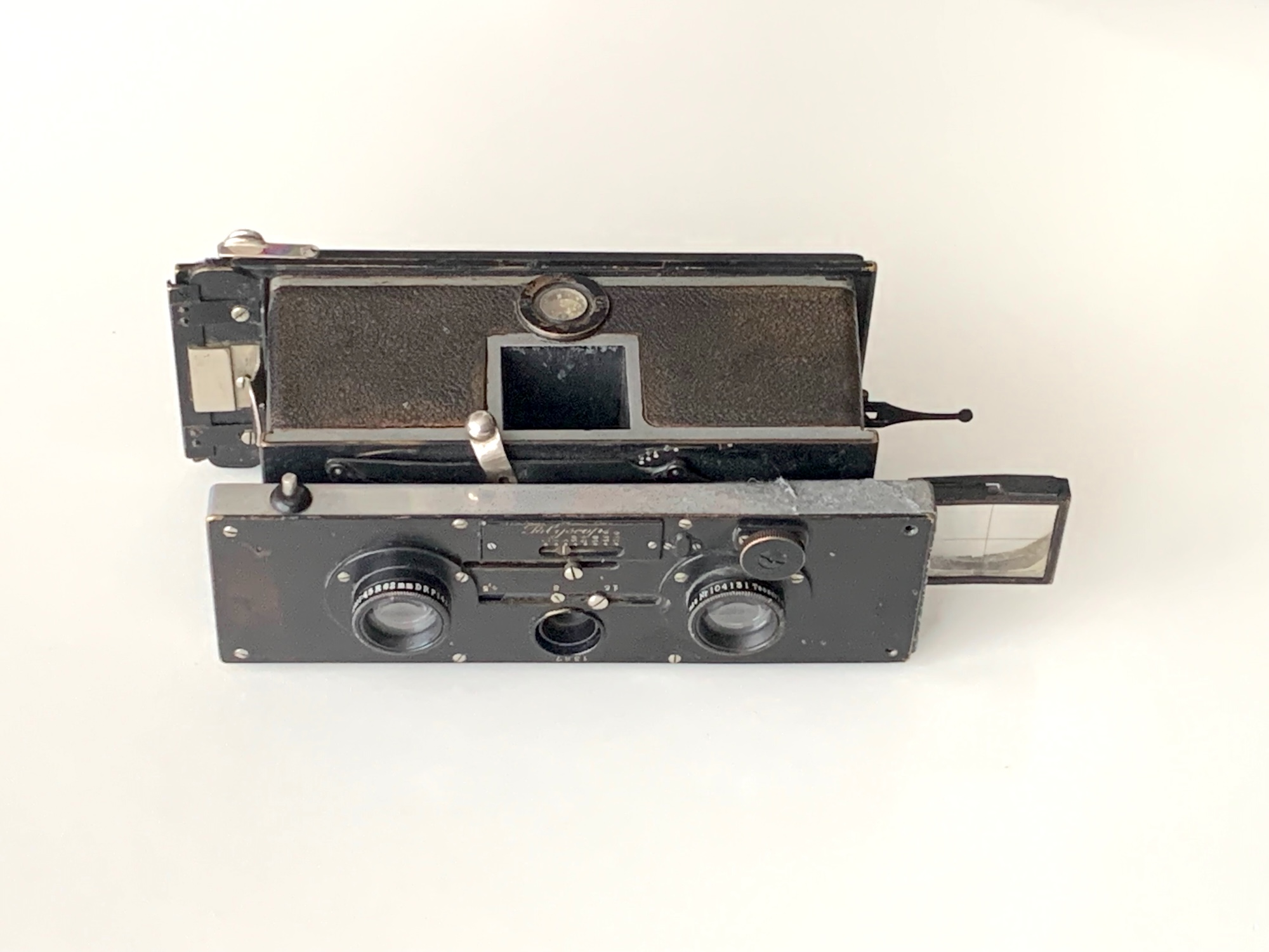 Es handelt sich um eine Stereokamera 4,5x10,7 in Kastenbauweise. Sie besitzt einen Guillotine-Verschluss mit dem Zeitenbereich 1/3–1/250; die Zeiten werden mit dem Drehrad rechts verstellt und in dem mittig angeordneten Fenster angezeigt. Diese Verschlussmechanik besitzen die Kameras ab der Nr. 1.000 (vgl. den Beitrag von Roland Sieboth in PhotoDeal 52 [2006], S. 60–64, hier S. 61). Die Entfernungseinstellung erfolgt mittels Koppelstange über einen Hebel. Die Belichtung kann mittels Lochblende in 3 Stufen (4,5 – 8 – 16) verstellt werden. Ins Gehäuse ist ein Brillantsucher eingelassen, für Aufnahmen aus Augenhöhe steht ein Newtonsucher zur Verfügung. Außerdem ist Kontrolle über die Mattscheibe möglich; zur Aufnahme des Mattscheibenrahmens oder von Einzelkassetten bedarf es eines Adapters; serienmäßig ist die Kamera für den Betrieb mit einem Wechselmagazin vorgesehen. (Das mitgelieferte defekte Magazin habe ich für das Foto entfernt, es ist ein Adapter mit Mattscheibenrahmen eingesetzt.) Verbaut sind zwei Tessare 4,5/62 mm.
