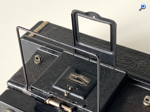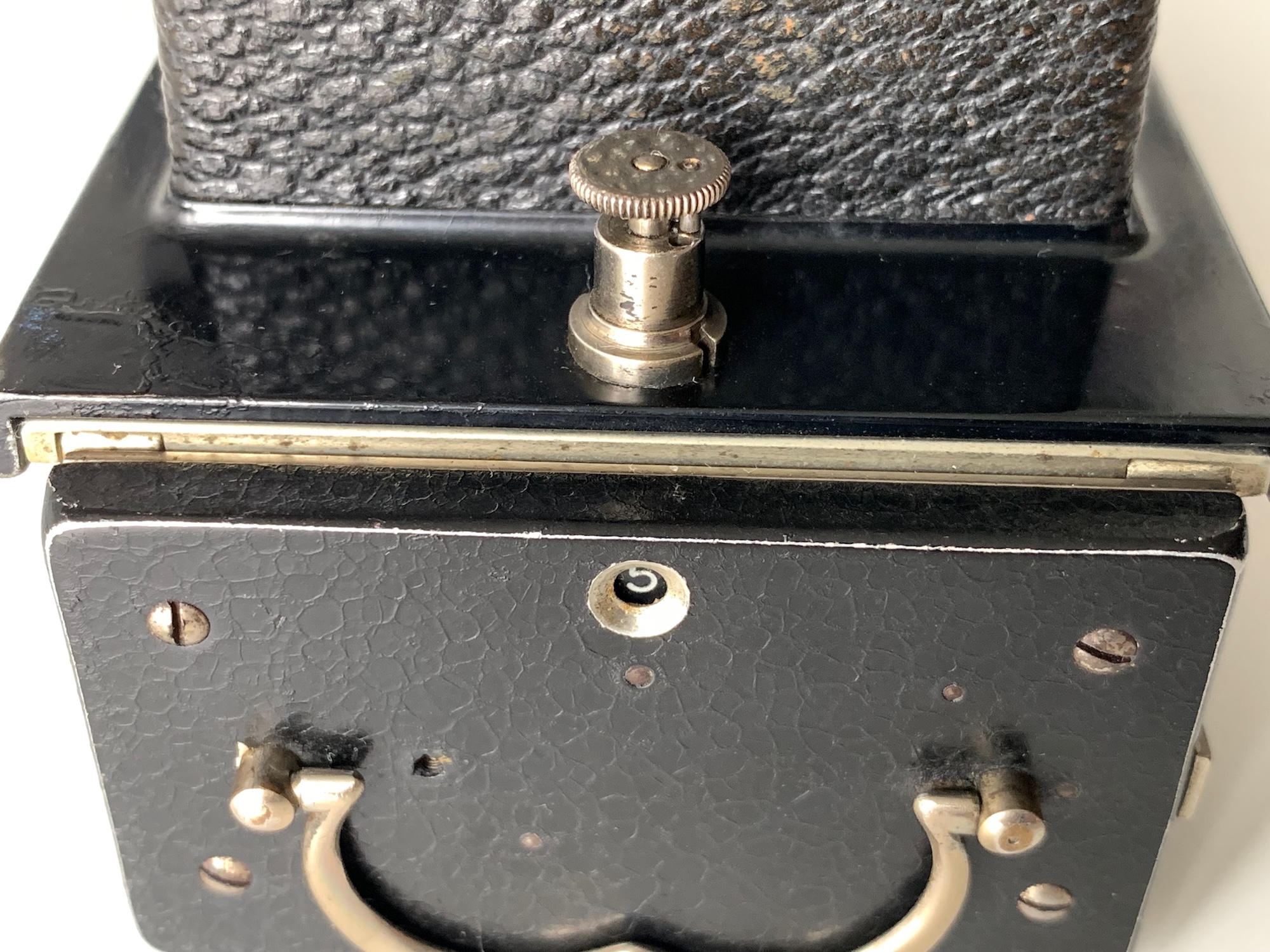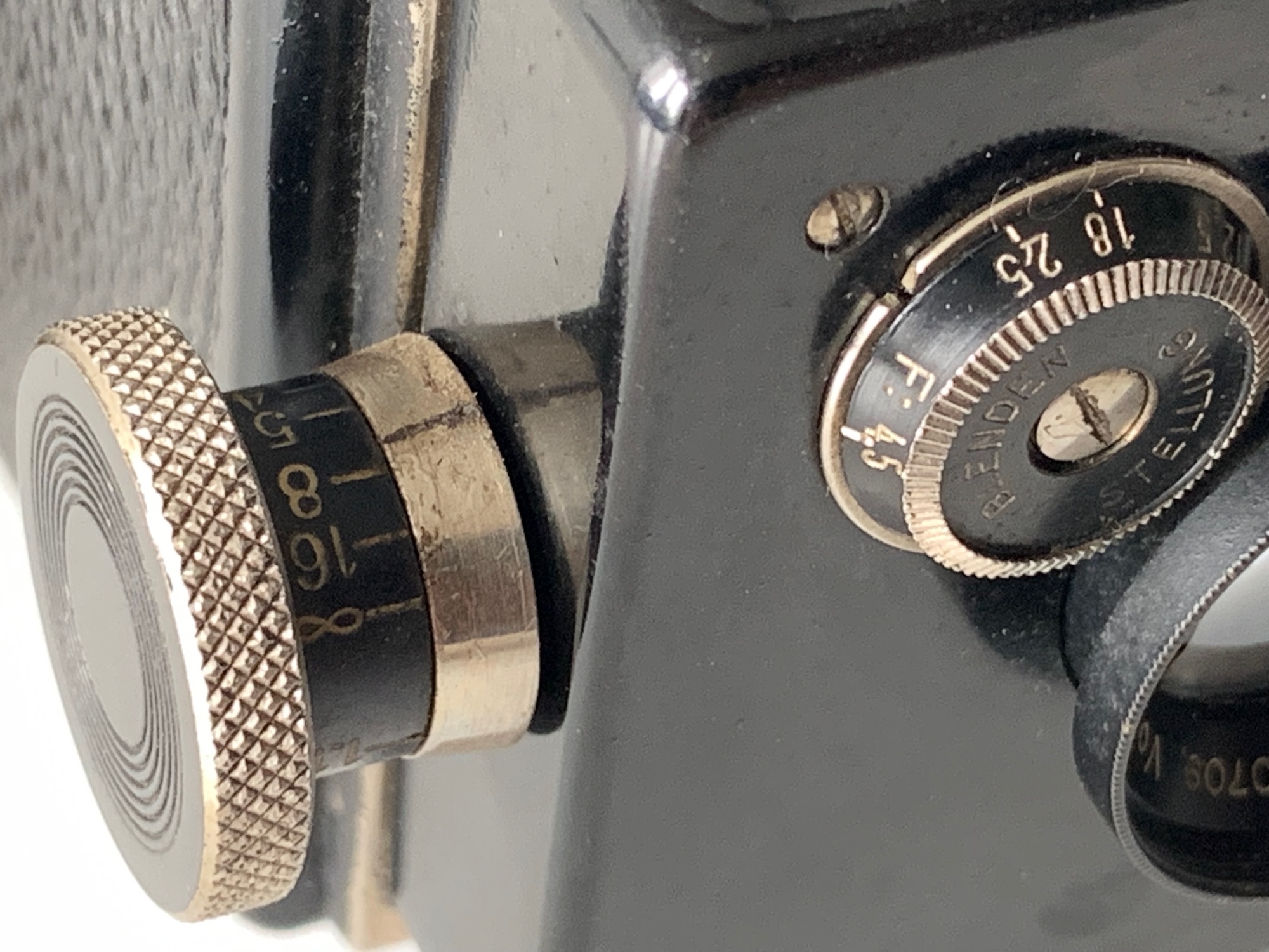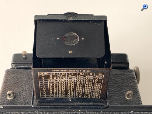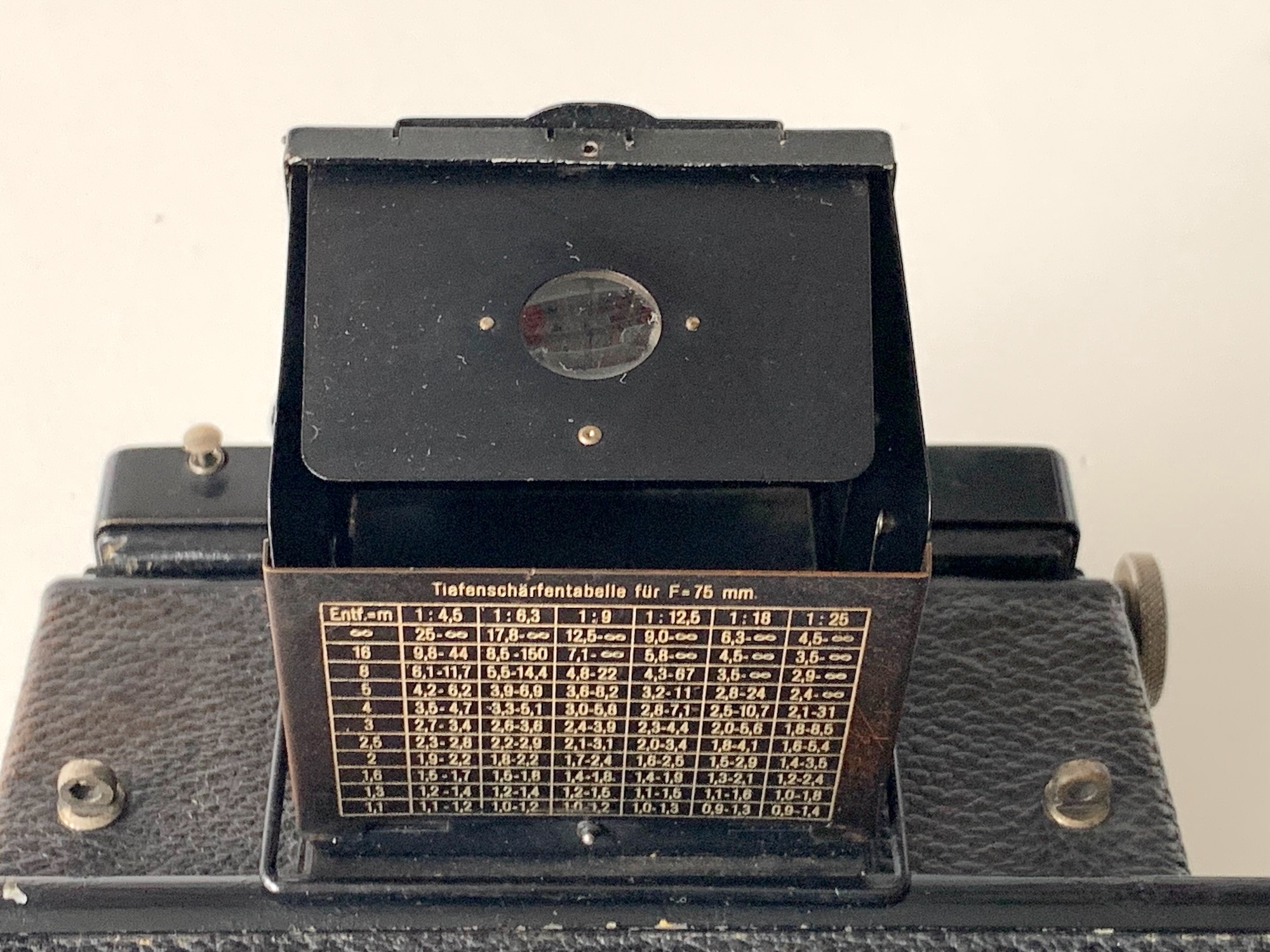 Dass es sich hier um das zweite Modell handelt, ist entscheidend. Denn beim etwas kuriosen ersten Modell in 6x13 (1925–1928) (--> https://blende-und-zeit.sirutor-und-comp...5&thread=52) wurde noch ein Sucherobjektiv mit 65 mm Brennweite verwendet, das das Bild auf eine kleine Mattscheibe 4x4 warf, während die Aufnahmeobjektive eine Brennweite von 85 mm besaßen. Es bedurfte daher zur Scharfeinstellung eines gesondertes Getriebes (s. Prochnow Bd. 2, S. 16-389).