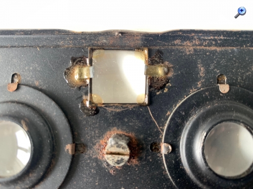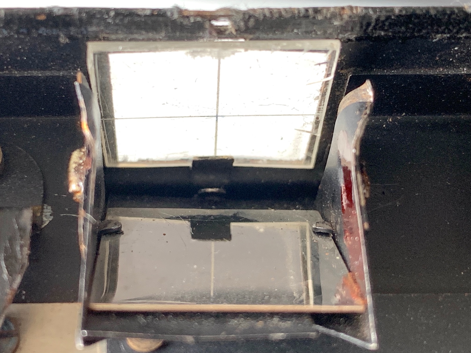 Ich schrieb eigentlich, denn: Es zeigt sich ein weiterer Unterschied hinsichtlich des Suchers: Die schwarze Version besitzt ein rundes Sucherauge und oben eine gewölbte Linse wie bei üblichen Brillantsuchern. Beim vorliegenden vernickelten Exemplar ist das Sucherauge eckig, die Linse wurde nach vorn versetzt. Oben befindet sich eine plane klare Scheibe mit Fadenkreuz. Hier gibt es im Innern Bastelspuren, und der Spiegel sitzt ein bisschen schief; es ist zu vermuten, dass da jemand hantiert und seiner Kamera einen größeren Sucher verpasst hat; es fehlt auch eine Schraube. Der Sinn dieser Änderung erschließt sich mir nicht – das Sucherbild wirkt zwar etwas größer, aber die Gegenstände sind tonnenförmig verzerrt – da nützt auch das (ohnehin nicht ganz präzise) Fadenkreuz nicht…