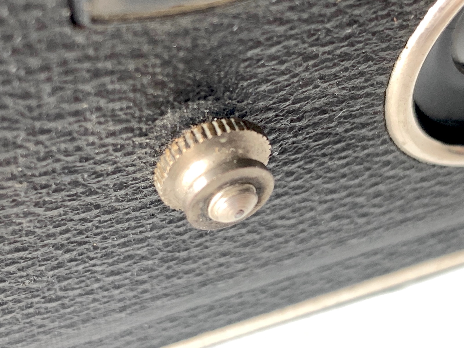 Das hier vorliegende Exemplar weist noch eine weitere Veränderung auf: In der Mitte der Frontplatte befindet sich eine Gewindestange mit Rändelmutter. Ich habe das zunächst für ein serienmäßiges Bedienungselement gehalten, es zeigte sich aber, dass hier ein Vorbesitzer an der Innenseite der Frontplatte eine Schraube eingesetzt hat (s. auch das Foto oben).