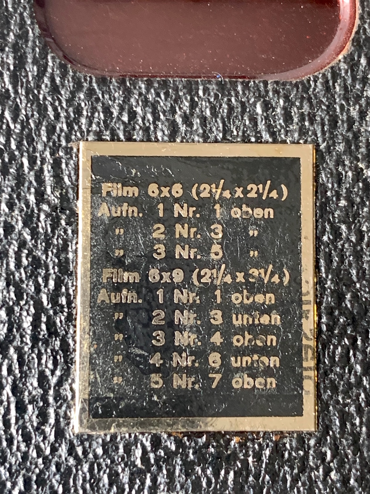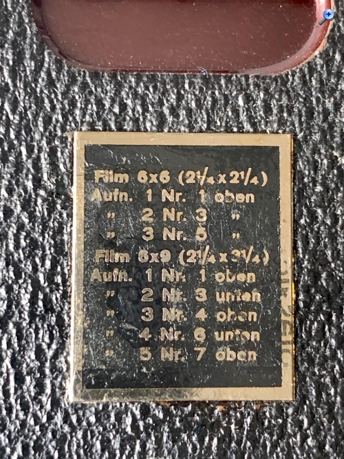 In der Anleitung ist es dargestellt: Für Aufnahme 1 muss die <1> im oberen Fenster (bei vertikaler Kamerahaltung) erscheinen, für Aufnahme 2 die <3> im unteren Fenster, für Bild 3 die <4> im oberen, für Bild 4 die <6> im unteren Fenster, für das letzte Bild schließlich die <7> im oberen Fenster: Ganz schön kompliziert (was die oben angesprochene einfache Handhabung wieder konterkariert); wer weiß, wie viele Aufnahmen durch unachtsamen Filmtransport verdorben wurden… Beim vorliegenden Exemplar war leider eins der (groß dimensionierten) Rotfenster beschädigt; ich habe vorläufig ein Stück aus einer defekten Kamera ergänzt. – Die Kamera kann aber auch für 10 Monoaufnahmen 6x6 genutzt werden. Dazu wird das rechte Objektiv mit einer vorschwenkbaren Abdeckung verschlossen, der Film bleibt an dieser Stelle unbelichtet: