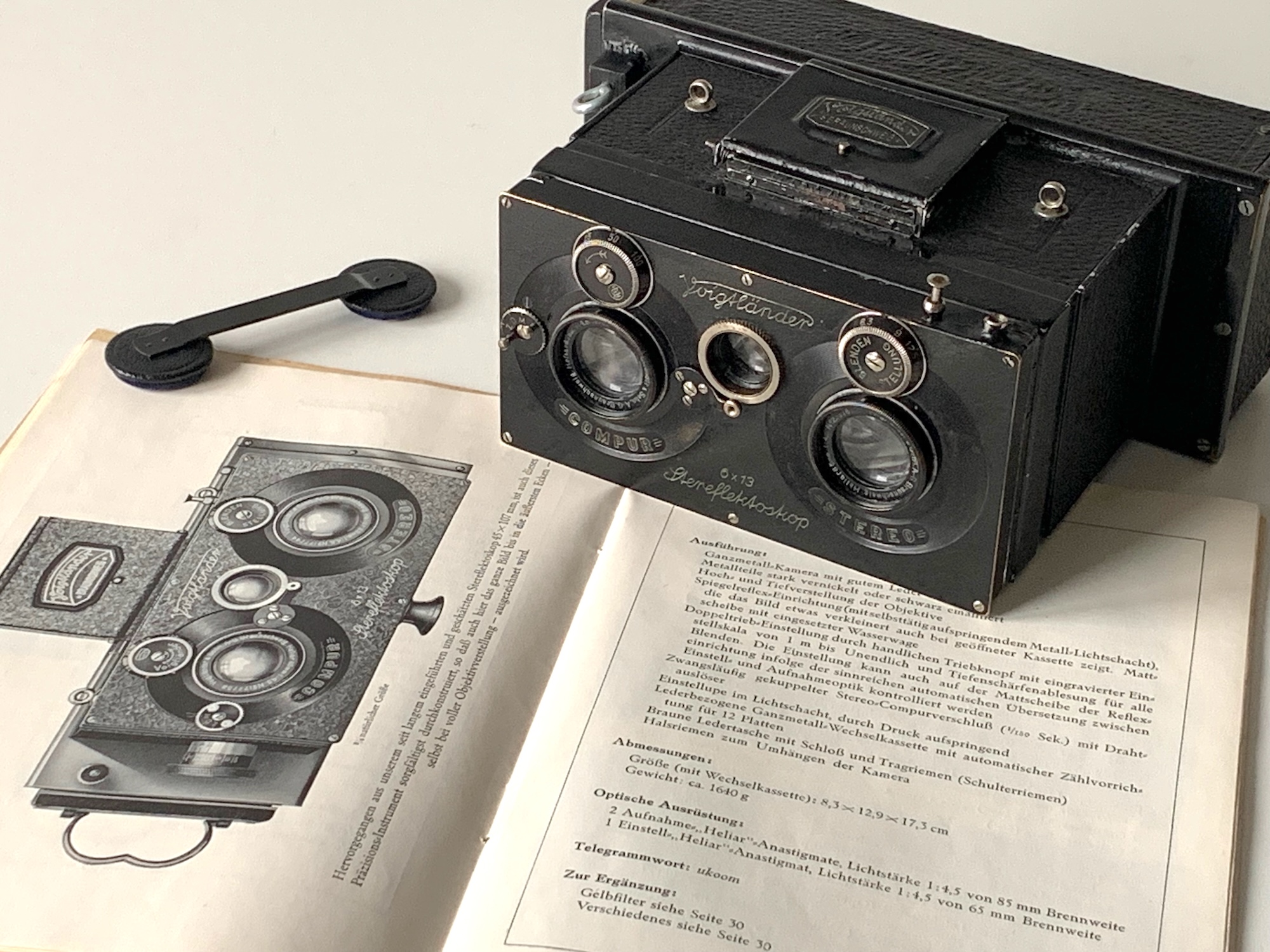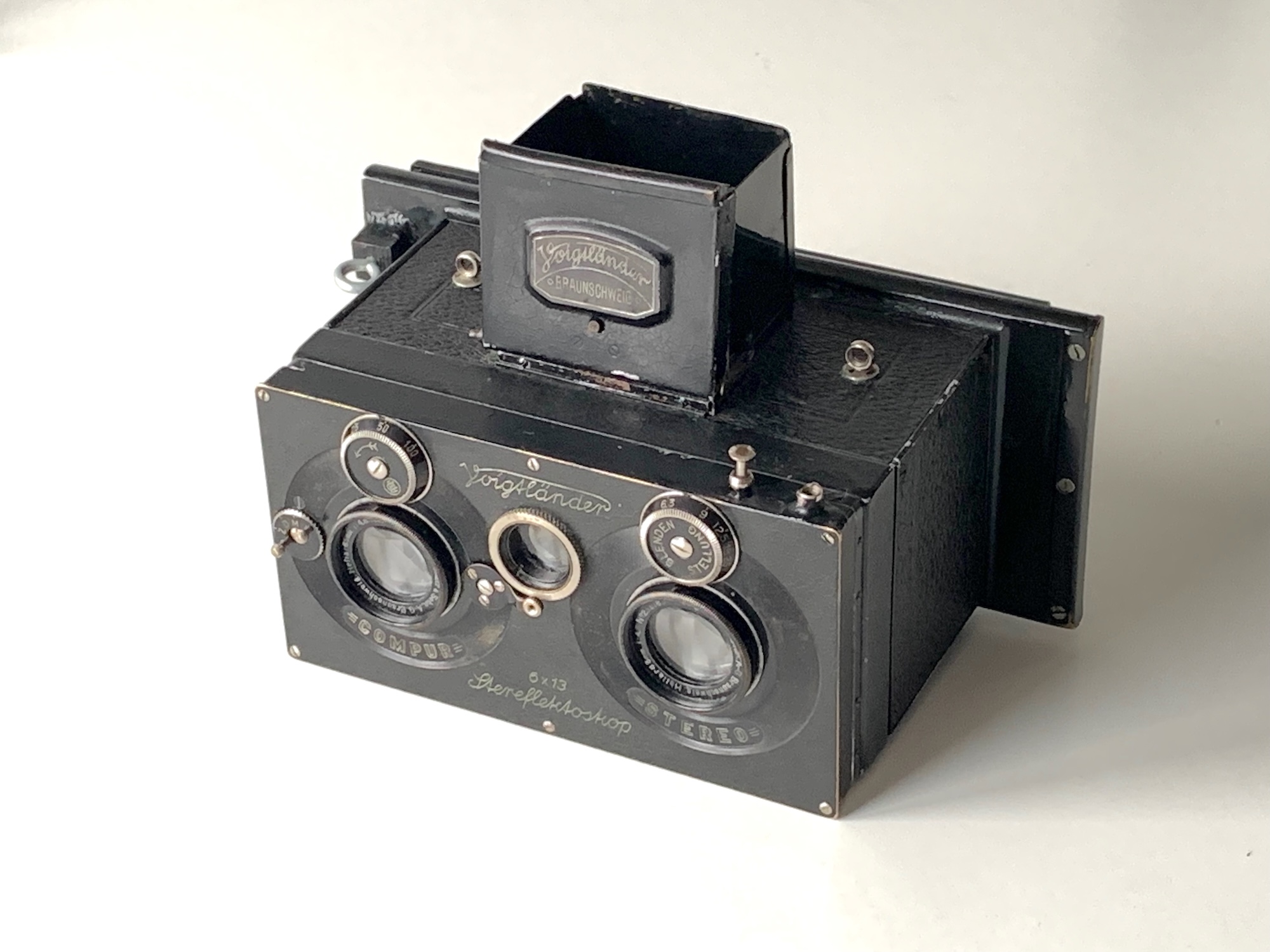 nachdem Voigtländer seit 1905 Erfahrungen mit starren Stereokameras im Format 4,5 x 10,7 und seit 1913 speziell mit dem dreiäugigen Stereflektoskop gesammelt hatte, folgte 1925 erstmals eine große Version des Stereflektoskop im Format 6x13. Dessen erstes Modell (Prochnow PR 2921), das hier vorgestellt werden soll, ist lt. Prochnow „die kurioseste Stereokamera, die Voigtländer je gebaut hat“ (Prochnow 2, 16–389). Wie er zu dieser Einschätzung kommt, wird gleich erläutert.