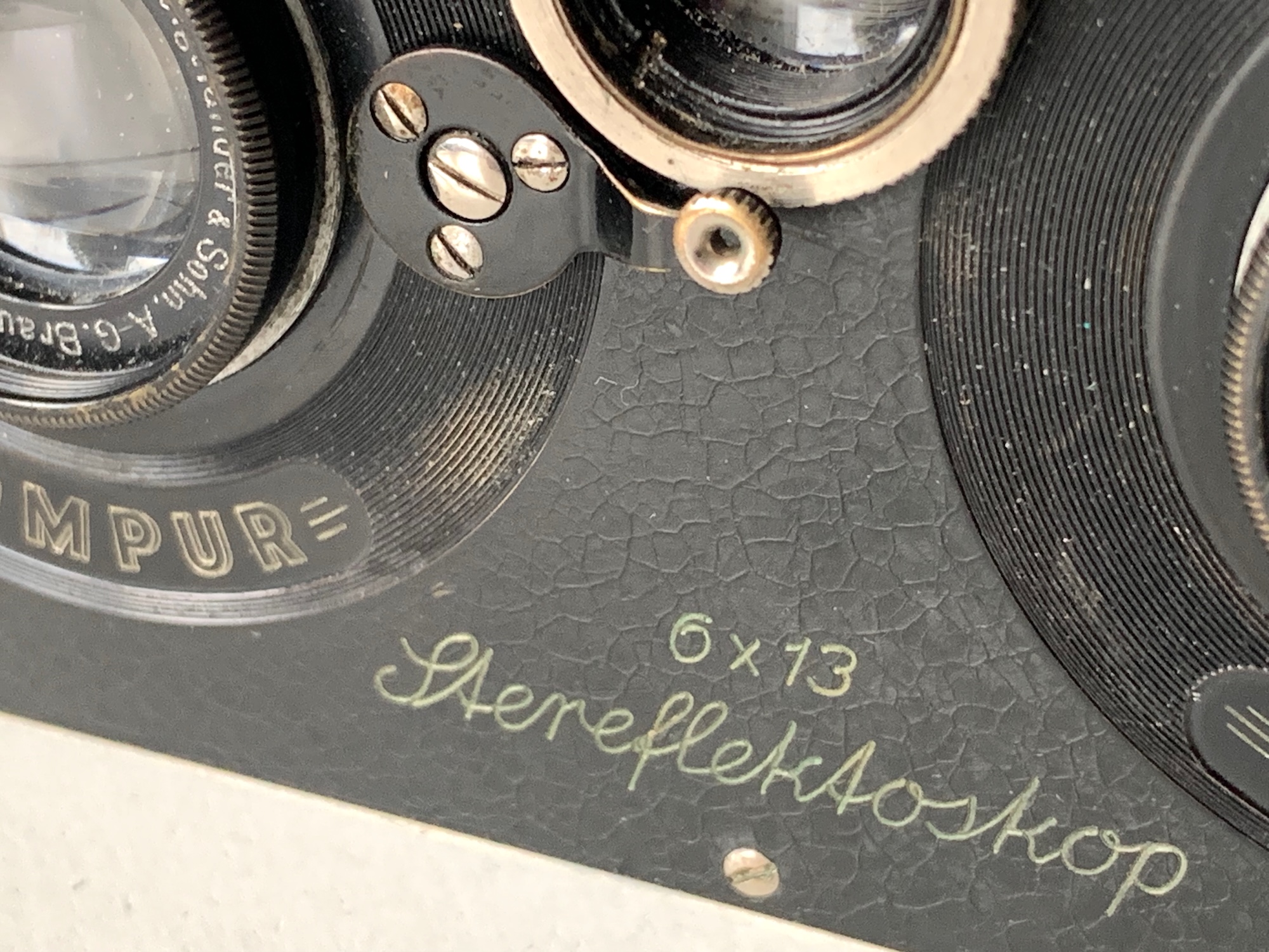 Es handelt sich um eine Stereo-Spiegelreflexkamera mit starrem Gehäuse für Platten im Format 6x13. Die etwas merkwürdigen Proportionen sind dem Umstand geschuldet, dass man in diese Kamera den Lichtschacht des kleinen Stereflektoskops (--> https://blende-und-zeit.sirutor-und-comp...5&thread=24) einbaute! Dessen Mattscheibe ist mit effektiv 3,5x3,8 cm nicht nur recht klein – wegen des kurzbrennweitigen Sucherobjektivs (Heliar 4,5/65) war auch ein größerer konstruktiver Aufwand erforderlich, um eine synchrone (Gesamt-)Verstellung aller drei Objektive zu ermöglichen: Es bedurfte eines Übersetzungsgetriebes. Bei den Aufnahmeobjektiven handelt es sich um zwei Heliare 4,5 mit einer für das Format nicht unüblichen Brennweite von 85 mm.