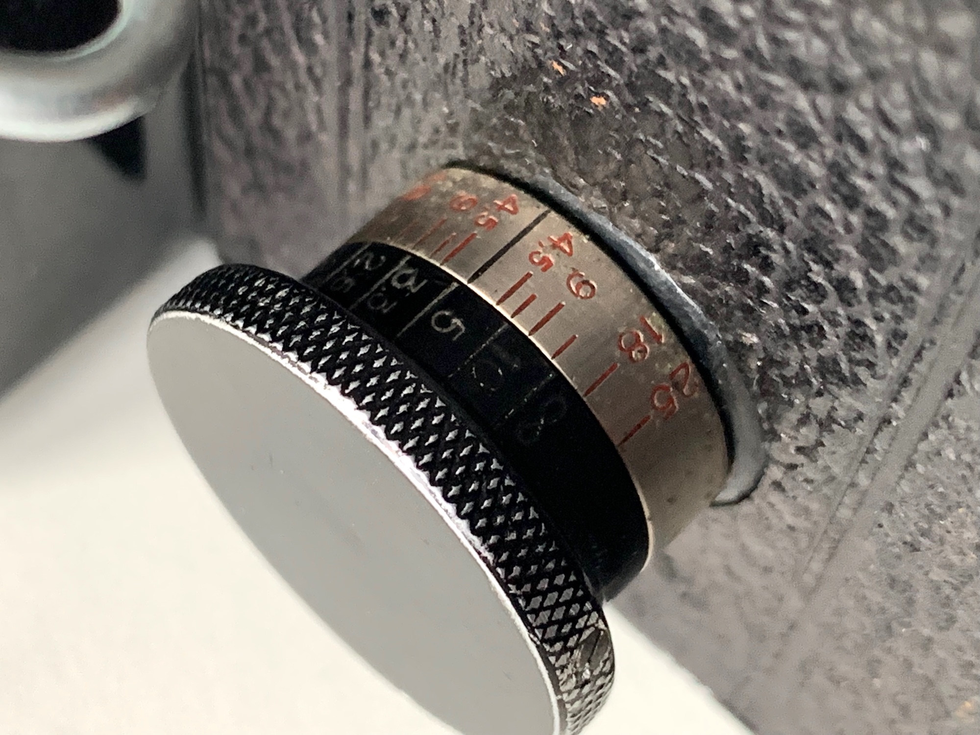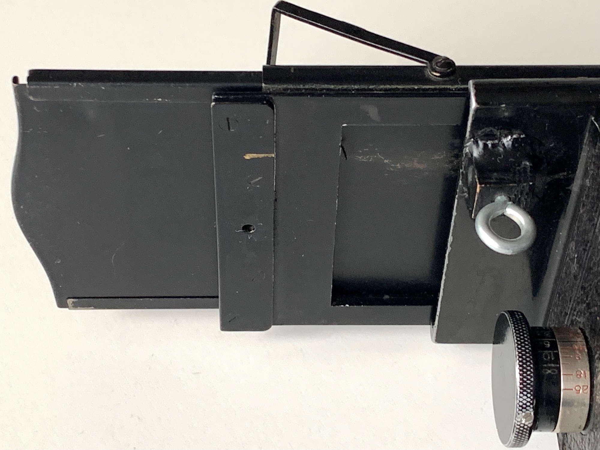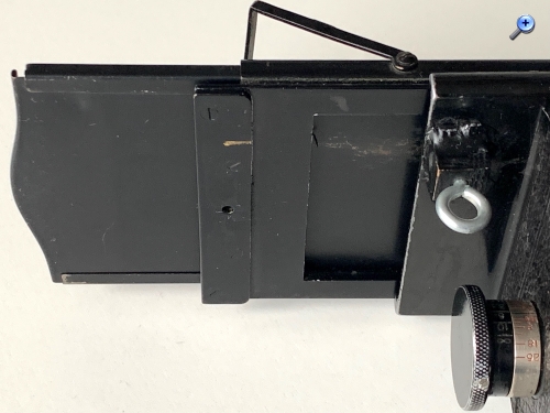 Beim vorliegenden Exemplar hat jemand den federnden Stift für die Rückteilverriegelung durch eine Ringschraube ersetzt; eine etwas rustikale Lösung. Die nach oben versetzte Position der Verriegelung ist allerdings korrekt; eine mittige Anordnung, wie sie das zweite Modell zeigt, würde zu einer Kollision mit dem Entfernungsknopf führen. Daraus folgt aber auch, dass frühe Rückteile und Kassetten eine Aussparung an entsprechender Stelle hatten und nicht in der Mitte; dennoch lassen sie sich untereinander austauschen, wenn auch ohne Verriegelung. Die leicht verlierbaren ledernen Objektivdeckel hat ein findiger Bastler mit einem Metallstreifen verbunden und somit bewahren können.
