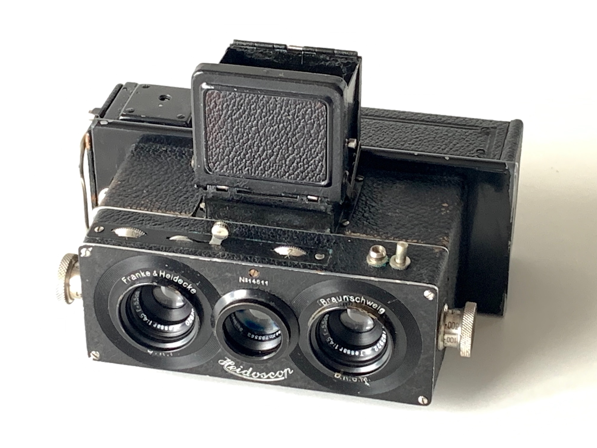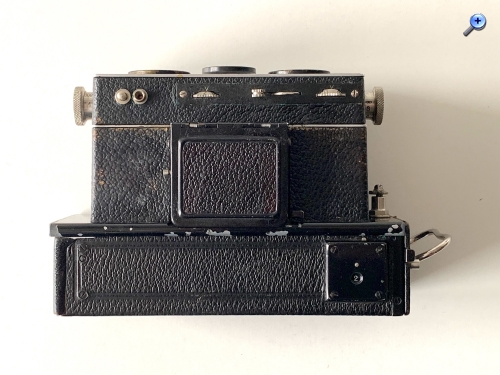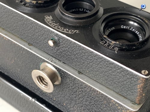 Es handelt sich um eine Spiegelreflex-Stereokamera für Platten im Format 4,5x10,7. Gegenüber dem ersten Modell, das an anderer Stelle bereits gezeigt wurde (--> https://blende-und-zeit.sirutor-und-comp...5&thread=25), weist die Kamera einige konstruktive Veränderungen und Verbesserungen der Bedienungselemente auf. Schon mit dem zweiten Modell (1925–27) war man von der Gesamtobjektivverstellung mittels Schneckengang zur (technisch schlichteren) Frontlinseneinstellung übergegangen. Dieses Konstruktionsprinzip wurde bis zum Ende beibehalten. Die Einstellung erfolgt bei allen Modellen mittels Drehknopf auf der rechten Seite, während mit dem Drehknopf links die Verschlusszeiten eingestellt werden. Verbessert war schon beim zweiten Modell die Handhabung, indem Spannhebel und Betriebsartenschalter auf die Oberseite verlegt wurden. Die sind beim ersten Modell nämlich schlecht zugänglich, wenn die Gegenlichtblenden eingeschraubt sind. Beim dritten Modell nun befindet sich auch das Blendeneinstellrad auf der Oberseite, sodass die Kontrolle der Bedienungselemente vollständig von oben erfolgen kann (ein Merkmal auch der späteren Rollei-Modelle). Bei den früheren Modellen befand sich die Blendeneinstellung noch an der Fassung des Sucherobjektivs.