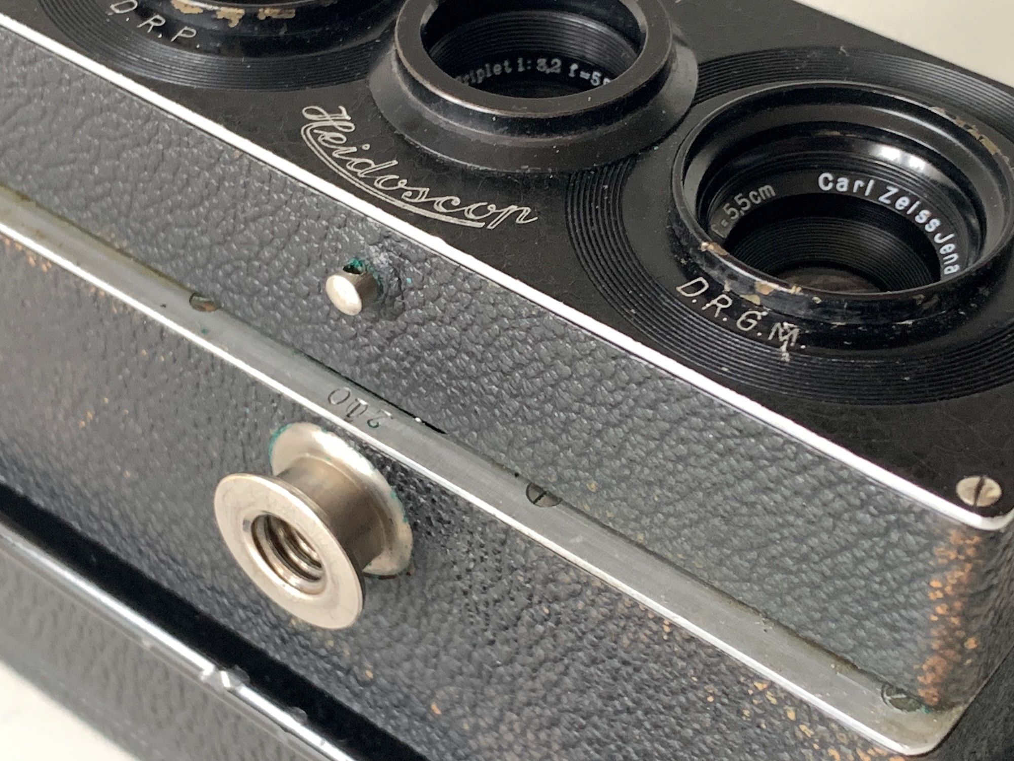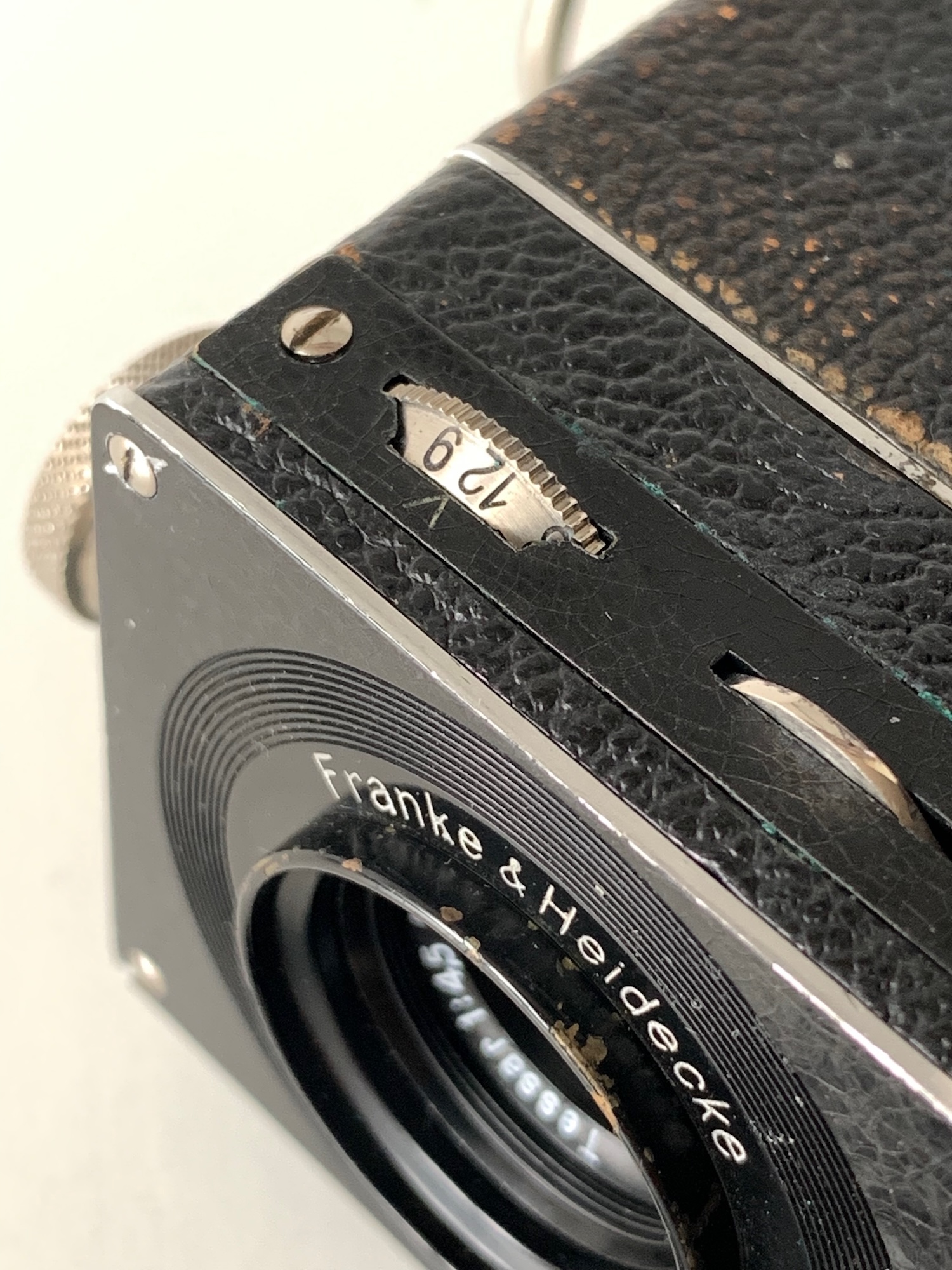 Verbaut sind wie üblich zwei Tessare 4,5/5,5 cm; die kürzeste Einstellentfernung beträgt 1 m. Das Sucherobjektiv (Triplet) hat eine Lichtstärke von 1:3,2. Der Luftbremsen-Zentralverschluss ist eine Eigenkonstruktion von Franke & Heidecke (Zeitenumfang 1–1/300). An der Öse auf der Unterseite muss ich noch die vorhandenen Objektivdeckel aus Metall, die über eine Kordel miteinander verbunden sind, befestigen.