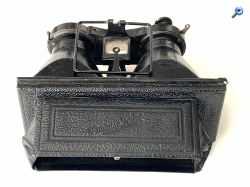 Es handelt es sich um eine Stereokamera in jumelle-Form für Platten im Format 4,5x10,7. Der Kamerakörper ist zweigeteilt wie bei einem Fernglas. Die Strahlengänge sind also strikt getrennt; das Verschlussgehäuse fungiert gewissermaßen als Brücke; unten ist ein Standfuß fest montiert. Ein Stativgewinde gibt es nicht, es handelt sich offenkundig um eine Handkamera für einfache Ansprüche. (Ich habe auf cameramania.ch die Abbildung eines Exemplars gesehen, bei dem unten ein Metallriegel mit Stativgewinde angenietet ist, dabei scheint es sich aber um einen nachträglichen, etwas rustikalen Umbau zu handeln.)