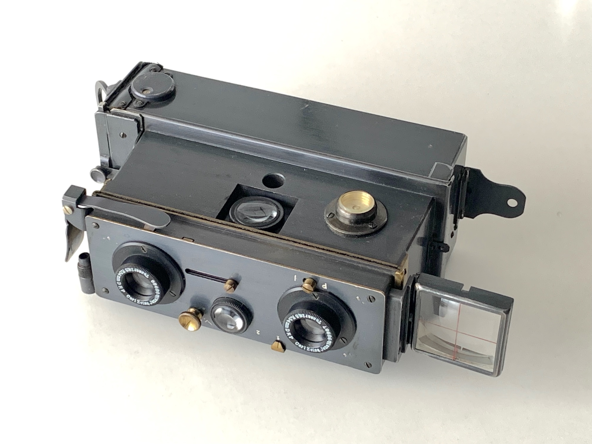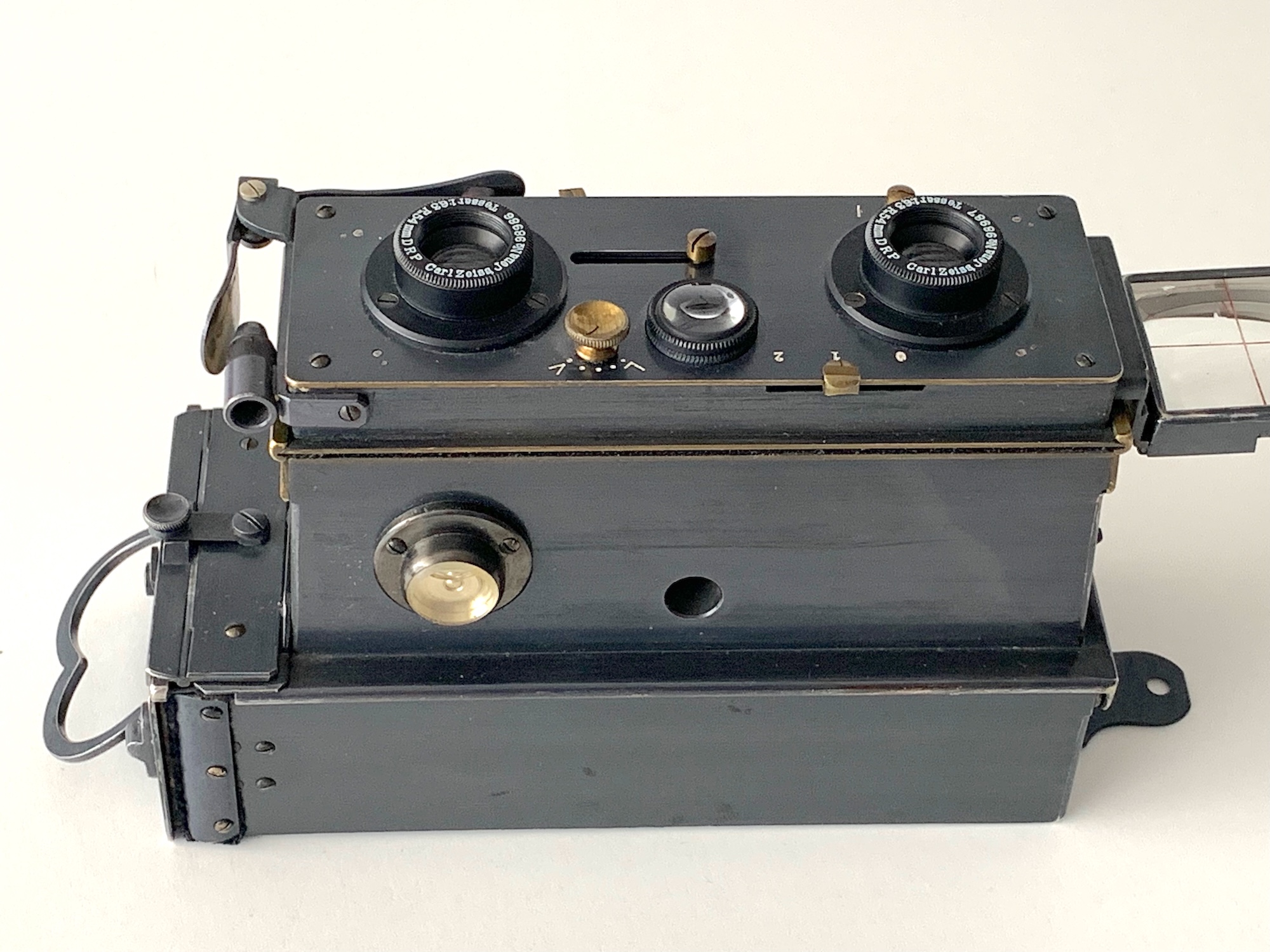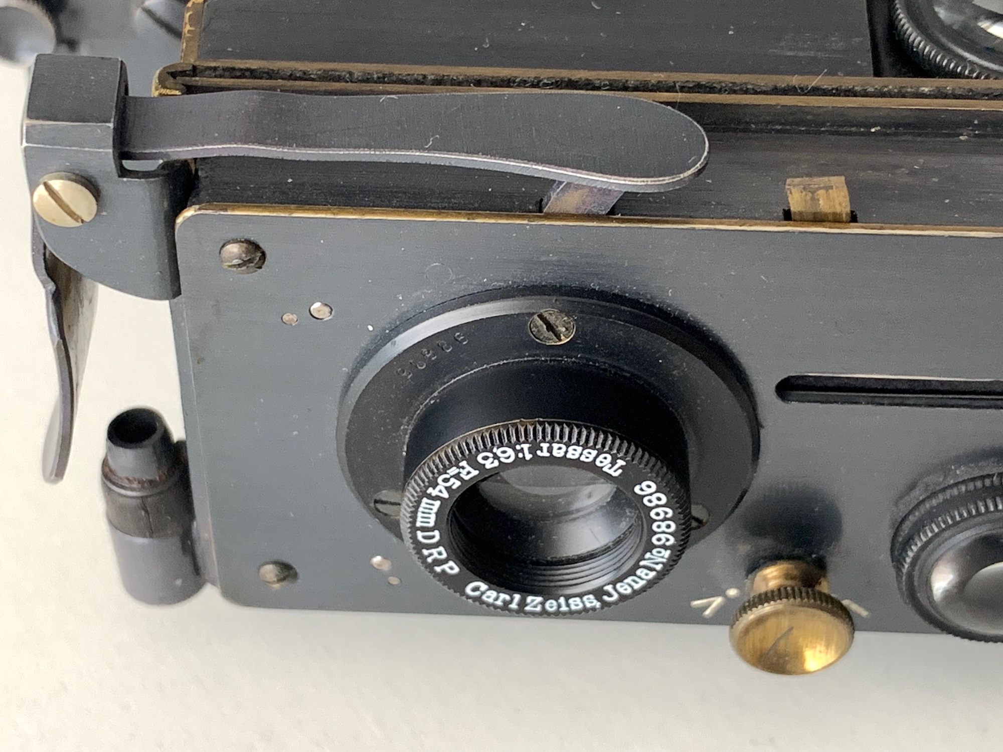 Das Objektivbrett ist vertikal verschiebbar. Das ist eine Neuerung, die mit dem Modell 1903 eingeführt wurde und seither Kennzeichen der besser ausgestatteten Varianten war. Das gilt auch für die Objektive, zwei CZJ Tessare 6,3/54 mm (einfache Varianten sind mit unbezeichneten Objektiven ausgestattet). Die fünfstelligen Seriennummern der Tessare legen eine Datierung vor 1910 nahe.