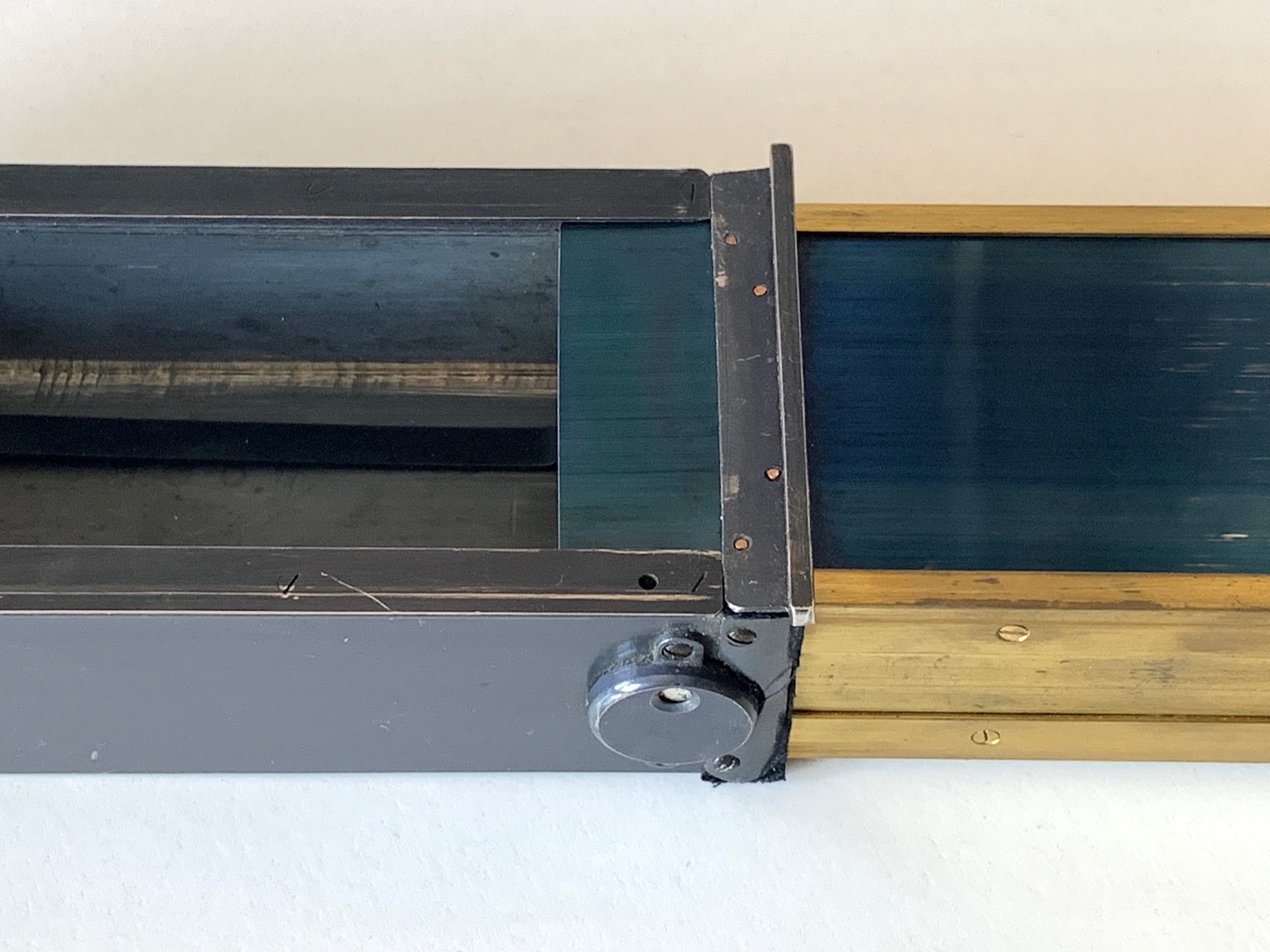 Es handelt sich um eine Stereokamera in Kastenbauweise für Platten im Format 4,5x10,7. Auffällig ist zunächst, dass das Metallgehäuse keine Belederung besitzt, was ihm auf den ersten Blick einen etwas rustikalen Charme verleiht. Das ist ein Merkmal aller Richard-Modelle, findet sich aber auch bei anderen französischen Stereokameras. Bei vielen Exemplaren ist die Oberfläche bereits angegriffen; die gezeigte Kamera präsentiert sich hingegen in sehr ansehnlichem Zustand, und der blaugraue Farbton wirkt recht elegant. Auf der Oberseite ist ein Brillantsucher eingelassen, daneben befinden sich eine Libelle und eine Bohrung, die einen Stativkonus aufnimmt. Seitlich ist ein klappbarer Newtonsucher für Aufnahmen aus Augenhöhe angebracht. Interessanterweise gibt es auch auf der Unterseite eine Libelle, sodass man die Kamera auch um 180° drehen oder Über-Kopf-Aufnahmen machen könnte…