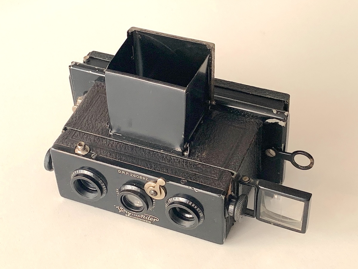 im Jahr 1913 brachte Voigtländer das erste Modell des Stereflektoskops 4,5x10,7 auf den Markt. Es handelt sich um eine Stereokamera mit starrem Gehäuse und Spiegelreflexsucher – das war die große Neuerung gegenüber dem zuvor produzierten Stereophotoskop (https://blende-und-zeit.sirutor-und-comp...5&thread=49) bzw. den Modellen anderer Hersteller (z. B. Ica Polyscop), die nur eingelassene Spiegelsucher besaßen. Mit dem Stereflektoskop war also eine exakte Entfernungseinstellung möglich, ohne dass erst ein Mattscheibenrückteil angesetzt werden musste.