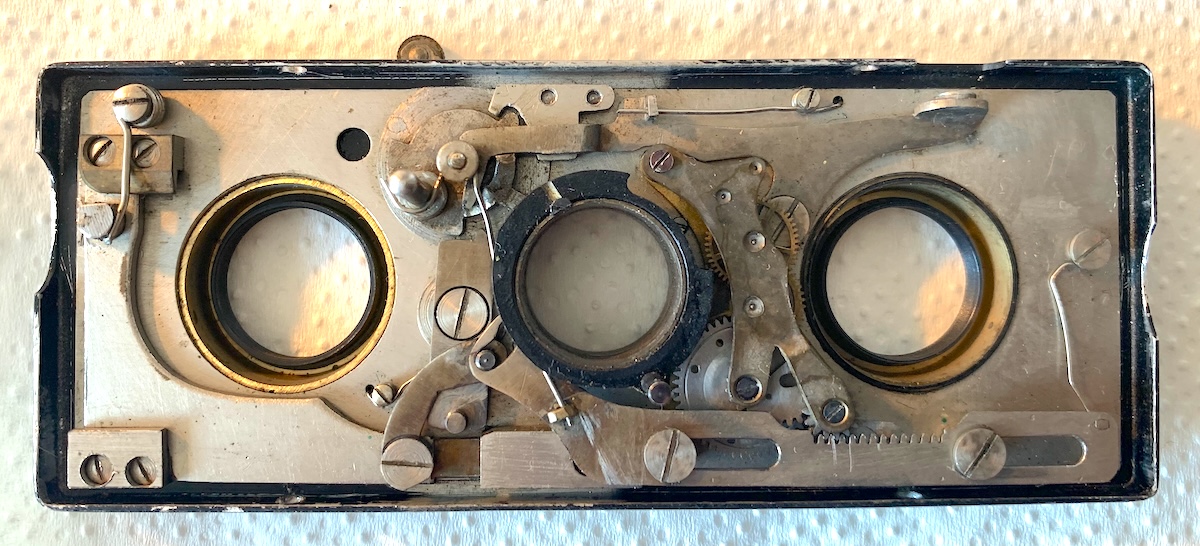 Angesichts der Beteiligung Heideckes bin ich davon ausgegangen, dass es sich um einen Luftbremsenverschluss handeln müsse, da F & H später in allen Heidoscopen ausschließlich selbst konstruierte Luftbremsenverschlüsse verwendete. Zu meiner Überraschung besitzt der Verschluss aber ein Räderhemmwerk. Die Mechanik befindet sich auf der Innenseite der Frontplatte. Deren Demontage ist auch erforderlich, um an die Objektive zu kommen.