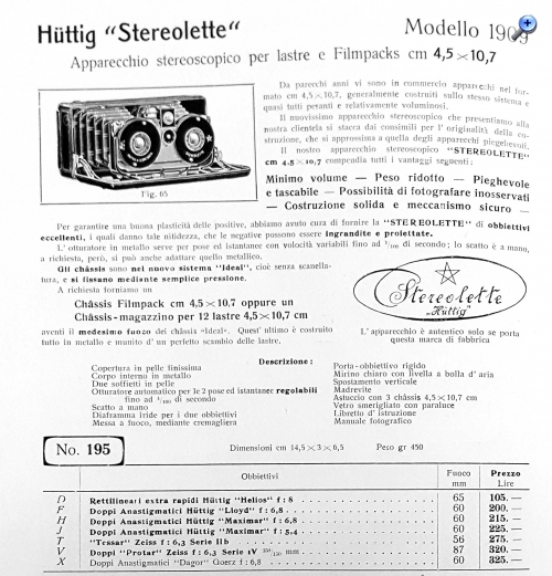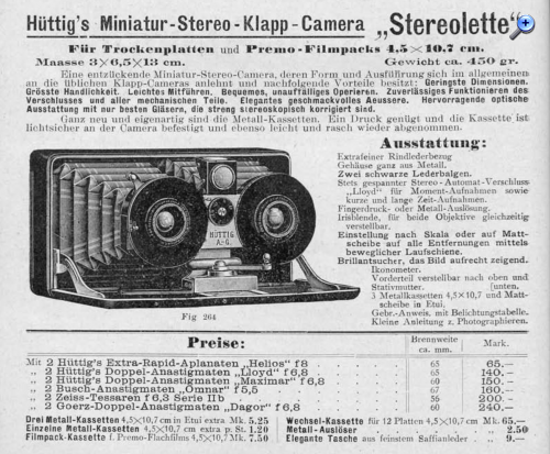 Die Stereolette wurde, wie schon erwähnt, bei der Fusion 1909 aus dem Hüttig-Programm übernommen. Händlerkataloge aus dem Jahr 1908 zeigen in der Tag die hier in Rede stehende Kamera, etwa der Katalog von Tauber von 1908: