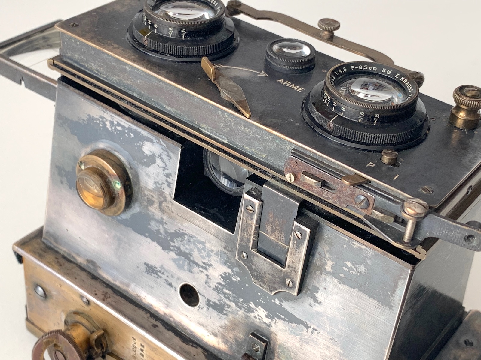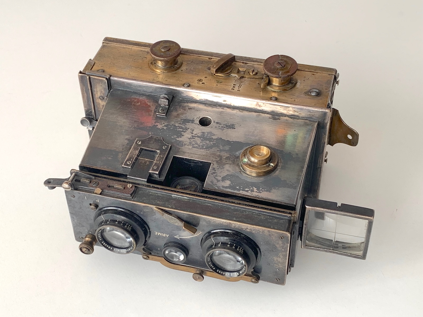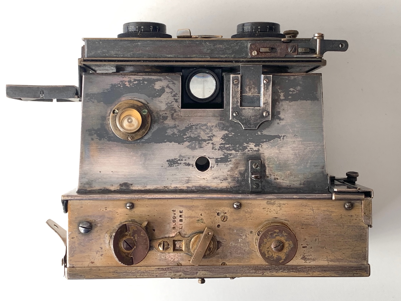 Die Kamera ist mit zwei Tessaren 4,5/8,5 cm des Pariser Lizenznehmers Eugen Krauss ausgestattet. Der Verschluss ist der auch in anderen Vérascopen genutzte Chronomos, ein Guillotine-Verschluss mit stufenlos einstellbaren Zeiten. Die Fronplatte ist vertikal verschiebbar. Zur Motivbeobachtung stehen ein eingelassener Spiegelsucher mit Fadenkreuz und ein ausklappbarer Newtonsucher zur Verfügung. Über eine etwas komplizierte Mechanik, die sich mir nicht ganz erschließt, kann ein Drahtauslöser angeschlossen und auf der Oberseite eingehakt werden.