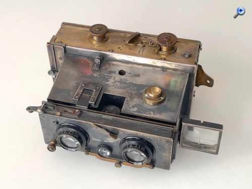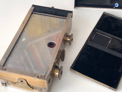 wie andernorts schon beschrieben, herrscht bei den Vérascope-Modellen des Pariser Herstellers Jules Richard eine beinahe unübersehbare Vielfalt von Modellen und Varianten. Auf der (leider noch immer nicht erreichbaren) Seite stereoskopie.com hieß es dazu: „Von der 'Verascope' (in allen Formaten) wurden insgesamt 78 Modell-Varianten mit 7 verschiedenen Wechselkassetten und 4 verschiedenen Rollfilmmagazinen hergestellt. Eine Zahl wie sie kein zweites Fabrikat auf dem Markt erreicht hat.“ Es ist nicht mein Anspruch, alle diese Varianten zusammenzutragen, aber ein kürzlich angebotenes Exemplar hat mein Interesse geweckt und soll hier vorgestellt werden.