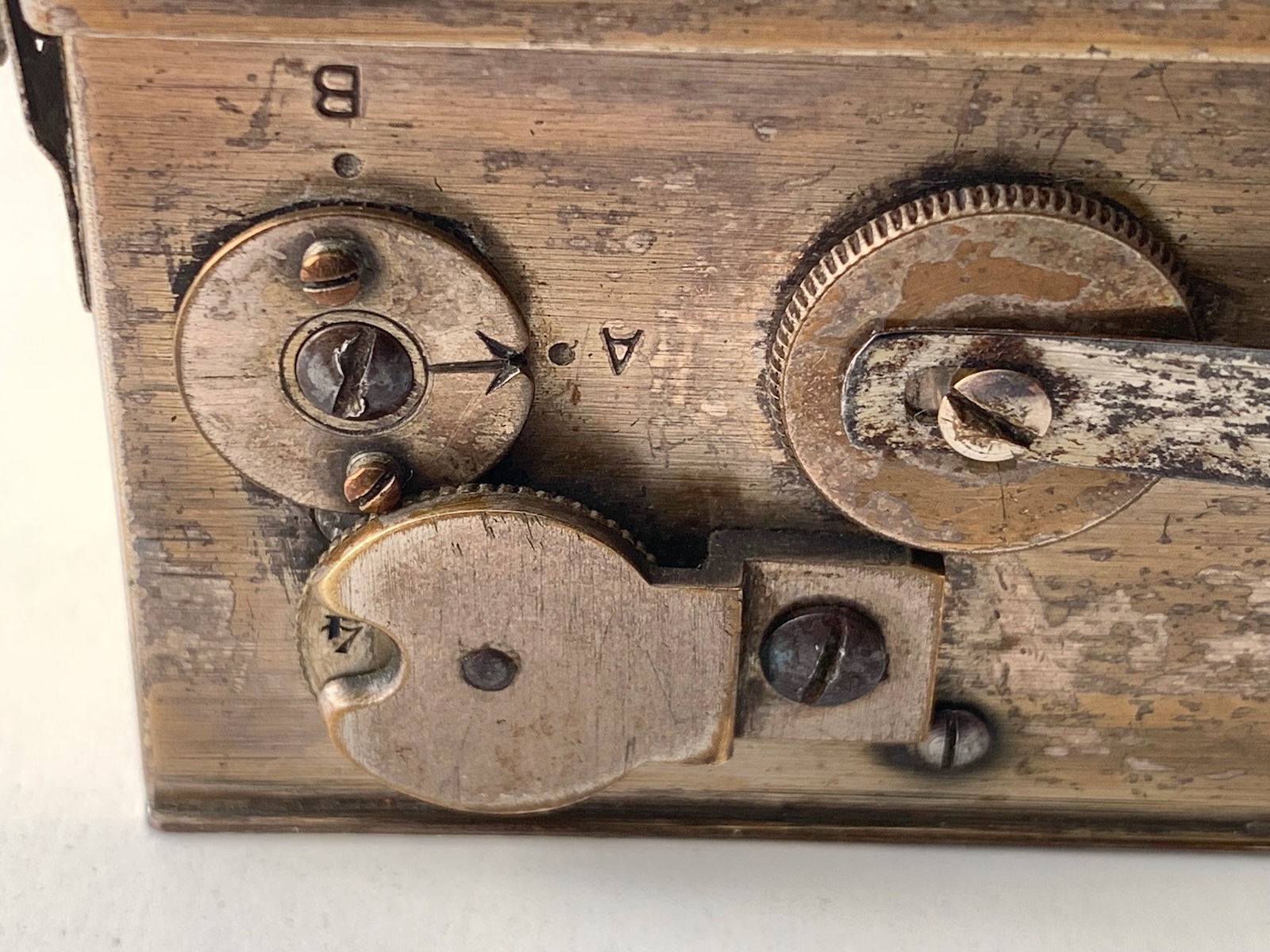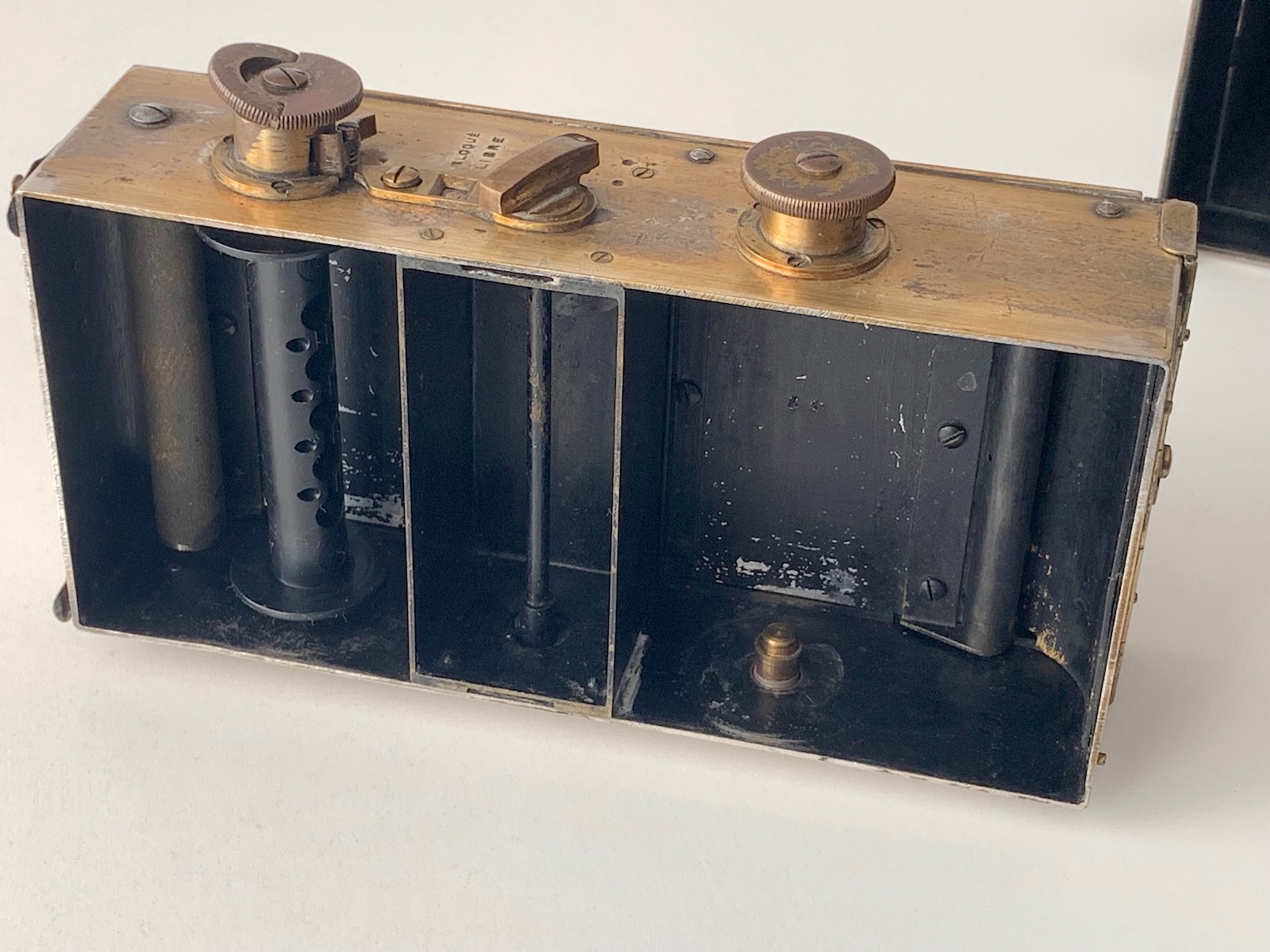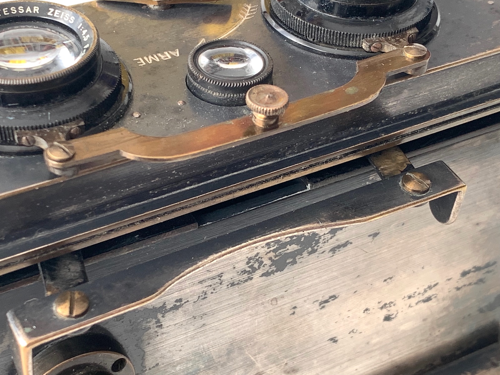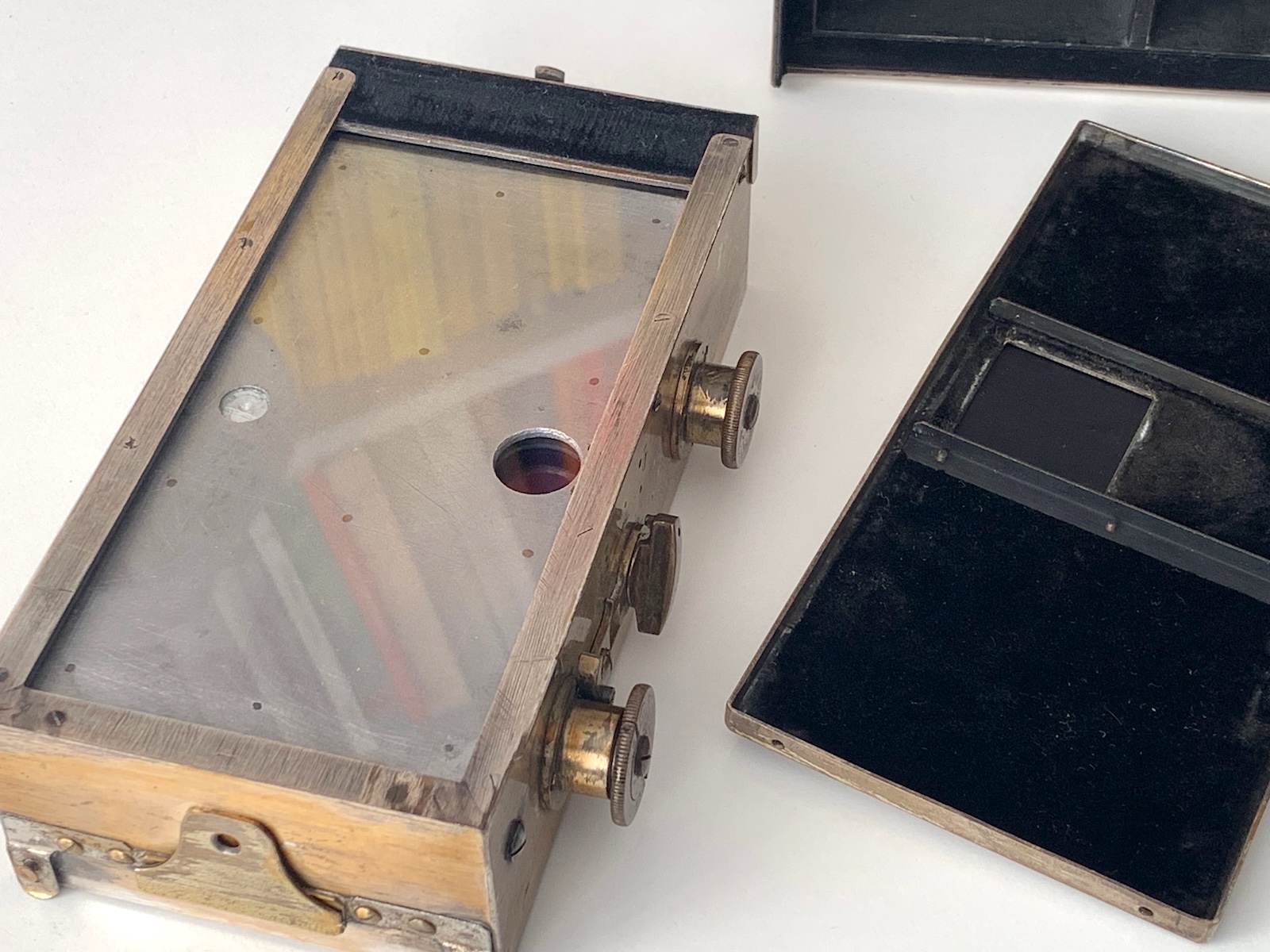 Bemerkenswert ist auch das Rollfilmmagazin, das mit der Kamera kam. Es gehört zum Systemzubehör, was nicht zuletzt darin zum Ausdruck kommt, dass an ihm der Diopter montiert ist; es trägt auch die Seriennummer. Vorgesehen ist es für Rollfilm 116, es passen aber auch 120er Spulen, was es natürlich für heutige Nutzer besonders interessant macht. Mir ist aber noch nicht klar, wie die Filmplanlage sichergestellt wird; auf der dem Objektiv zugewandten Seite ist eine klare Glasplatte montiert, die aber entfernt werden muss, wenn ein Film eingelegt wird. Das muss ich noch testen; auch Rotfenster und mechanisches Zählwerk werden für 120er Film nicht ausgelegt sein.