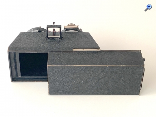 Ausführung und Ausstattung sind eher schlicht: Die Kamera besitzt ein Ganzmetallgehäuse mit Hammerschlaglackierung. Eine Entfernungseinstellung ist nicht vorgesehen. Das kenne ich sonst nur von Modellen im Format 4,5x10,7, deren kurzbrennweitige Objektive eine Fokussierung für den Nahbereich überflüssig machen. Dieses Modell in 6x13 besitzt aber zwei Huet-Anastigmate 5/75; wie groß der Schärfebereich ist, kann ich mangels Mattscheibenrückteil z. Zt. nicht testen; ich muss mal probieren, ob Rückteile anderer Kameras passen. Die Objektive sitzen in einem Stereo-Ibso (1–1/100). Als Sucher steht ein ausklappbarer Newtonsucher zur Verfügung.
