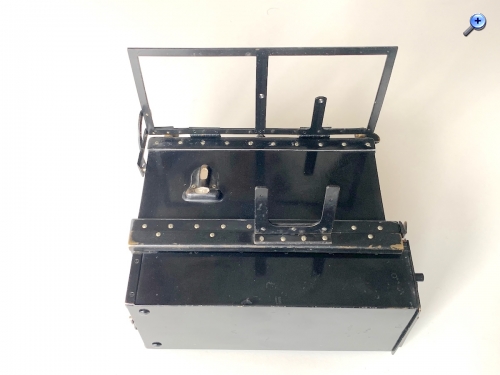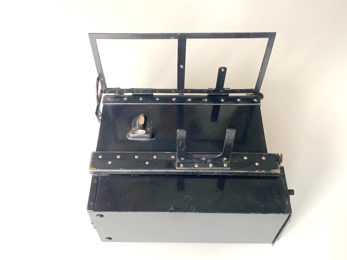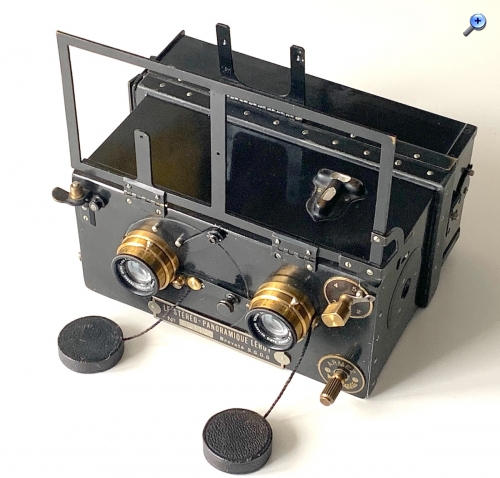 Es handelt sich um eine Stereokamera in Kastenbauweise für Platten 6x13 mit zusätzlicher Panoramafunktion; das ist zunächst nichts Ungewöhnliches. Das Gehäuse besteht aus schwarz lackiertem Metall (Stahlblech); auffällig die zahlreichen kleinen Schrauben, mit denen die Teile des Kamerakörpers verbunden sind. Der Apparat ist gut verarbeitet, aber man merkt doch, dass sie aus einer Manufaktur und nicht aus einer Fabrik stammt. Auch die doppelte Arretierung des Magazins besitzt einen gewissen handwerklichen Charme.