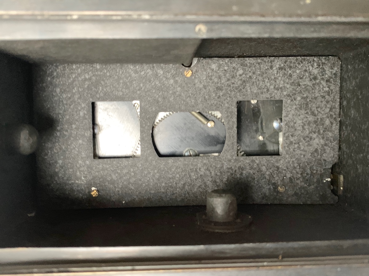 Anders als bei allen anderen mir bekannten Stereokameras muss die Blende an beiden Objektiven separat eingestellt werden; die sonst übliche mechanische Kupplung durch eine Koppelstange ist nicht vorgesehen. Das hat aber einen konstruktiven Grund: Das (aus Fotografensicht) rechte Objektiv ist nämlich exzentrisch auf einer drehbaren Platte befestigt; es kann durch entsprechende Drehung in die Mitte der Frontplatte bewegt werden. Die Bewegung bewirkt zugleich ein Ausschwenken der Stereoscheidewand aus dem Strahlengang; die Kamera ist damit für Panoramaaufnahmen vorbereitet. Bei anderen Kameras erfolgt die Einstellung der Panoramafunktion über eine Verschiebung der Frontplatte (z. B. hier zu sehen: https://blende-und-zeit.sirutor-und-comp...5&thread=58). Das zweite Objektiv muss für Panoramaaufnahmen abgedeckt werden; die beiden Objektivdeckel aus Leder sind auch noch vorhanden.