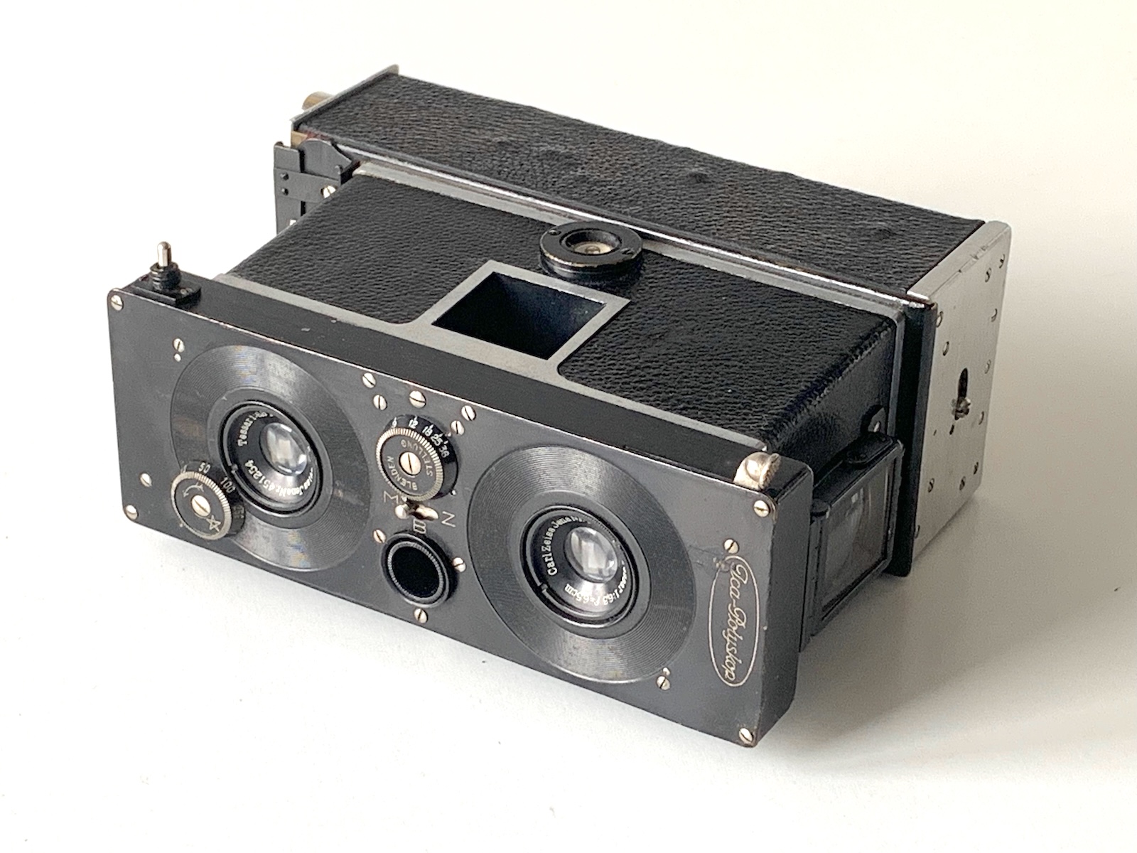 Dass auf die Möglichkeit der Naheinstellung verzichtet wurde, war gerade bei preiswerten Stereokameras im Format 4,5x10,7 keine Seltenheit, angesichts der kurzen Brennweite und der üblichen Motiventfernungen in diesem Sujet war damit auch keine größere Einschränkung verbunden. Das Polyskop 605 steht damit auch preislich zwischen dem einfacheren Modell Stereofix 604 (--> https://blende-und-zeit.sirutor-und-comp...5&thread=50) und den ‚vollwertigen‘ Polyskopen 606 und 607 (letzteres Modell ermöglicht zusätzlich die vertikale Verstellung der Objektive).