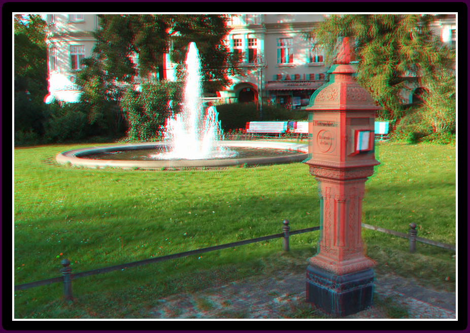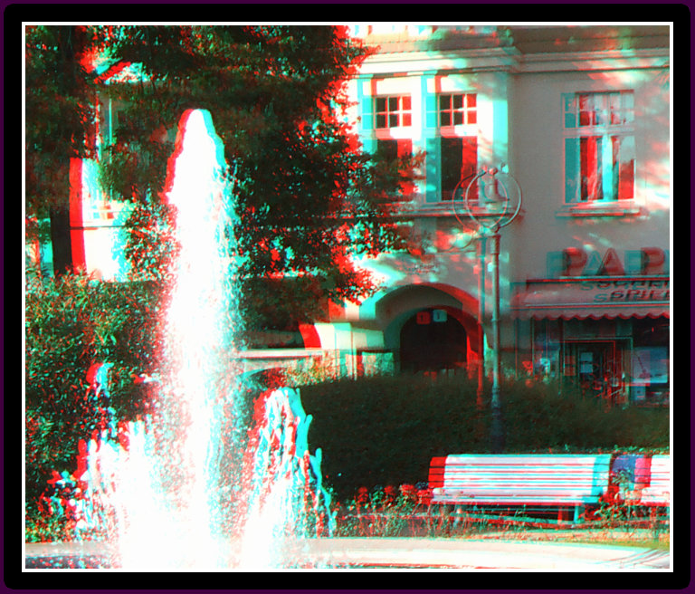 Die 3D Bildqualität ist echt super! Wenn man die einzelnen Wassertropfen des Springbrunnes im Detail mit der RB Brille betrachtet ist noch immer ein schöner räumlicher Eindruck erkennbar.