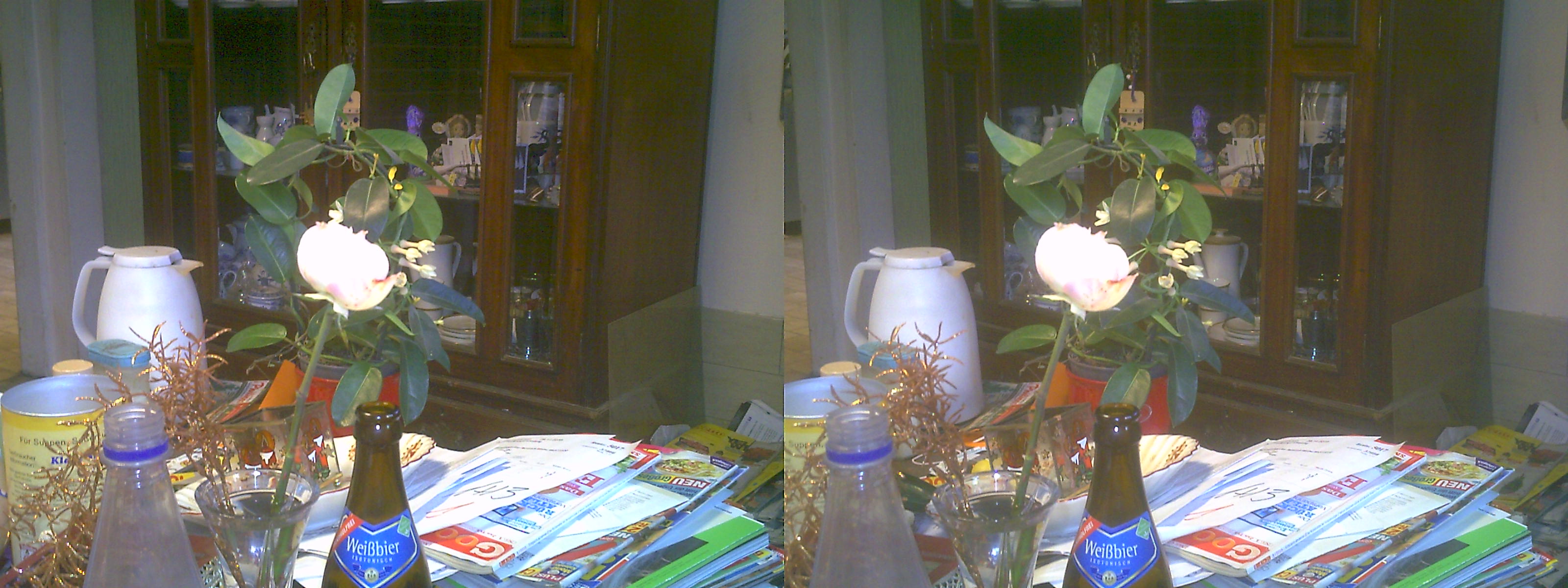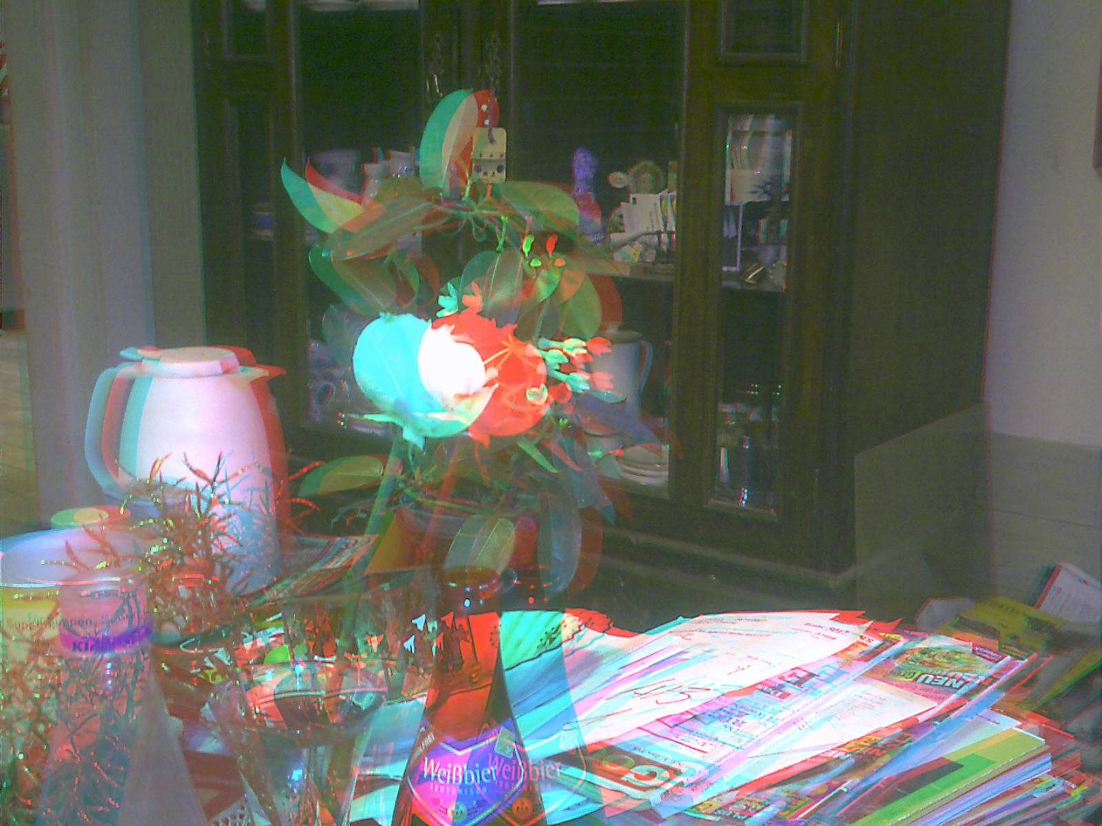 Die 3D Bilder aus der Camera kommen auf meinem Bildschirm ganz gut zur Geltung mit schönem Tiefeneffekt, wenn ich sie mit einer rot-blau Brille betrachte. Speziell das "Weißbier Foto" und die Analogen Filme im letzten Bild. Über eine rot-blau Umwandlung brauchst du dir keine Sorgen machen, sie werden schon als "rot-blau Bilder" ausgegeben Das rechte Objektiv dürfte etwas mehr verschmutzt sein als das linke