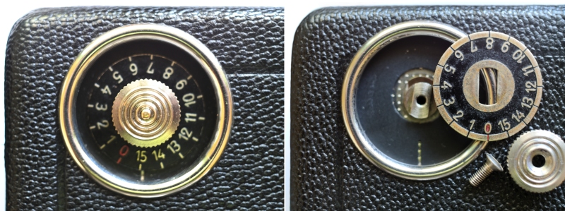 Ich legte also die vollaufgezogene Kamera ersteinmal wieder weg. Am nächsten Tag prüfte ich genauer: Das Federwerk war total entspannt, also abgelaufen. Wie das? Ich konnte neu aufziehen. Dabei sah ich, dass der Auslöser noch in Stellung "Dauerlauf" stand. Da es im Zimmer sehr still war, konnte ich im 3 - Sekundenabstand ein LEISES Klicken hören. Siehe da. Die Kamera lief ganz langsam ! Der Greifer erzeugte das Knacken. Bei genauem Hinsehen sah man das Aufwickelrad sehr langsam in Bewegung.