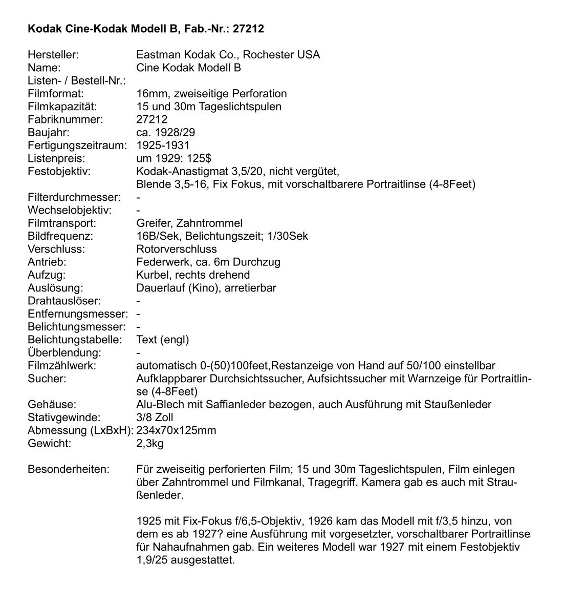 1925 kam die Cine-Kodak B mit Federwerkantrieb auf den Markt, kleiner als die Vorgängerin (jetzt Cine-Kodak A genannt) aber doch noch so groß wie ein Ziegelstein. Einfach ausgestattet, Fixfokus 6,5/20mm, 16 B/Sek, zunächst nur mit Aufsichtssucher, ein als Kit erhältliche Newton-Sucher floss erst später in die Fertigung ein.
