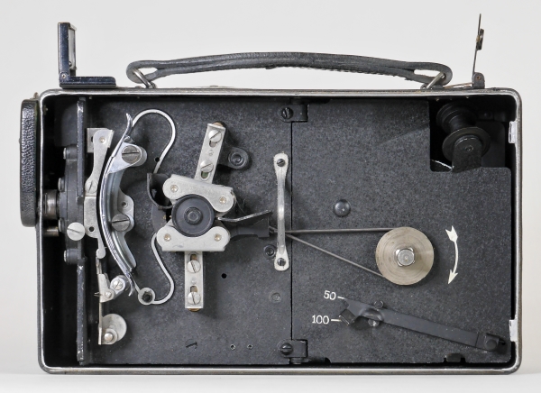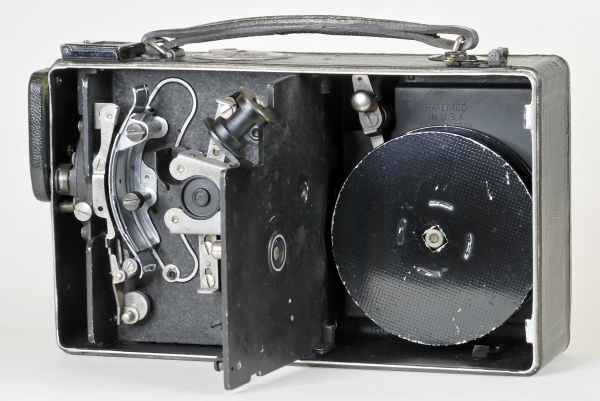 Das Besondere an der Kamera war, dass die 15 bzw. 30m Tageslichtspulen nebeneinander in der Kamera lagen, die Vorratsspule auf der Rückwand und die Aufwickelspule darüber auf einer aufklappbaren Innentür.