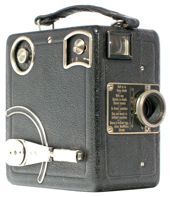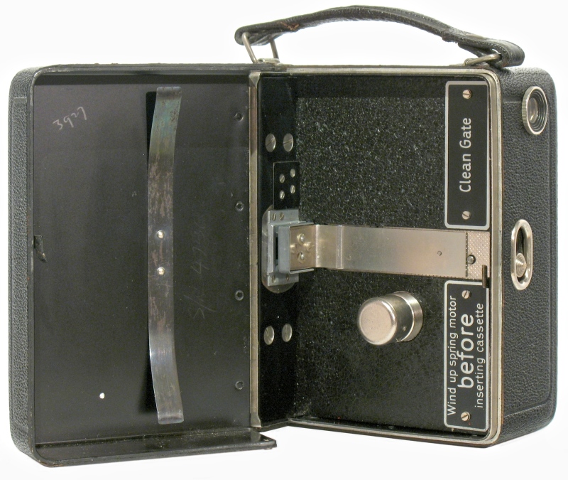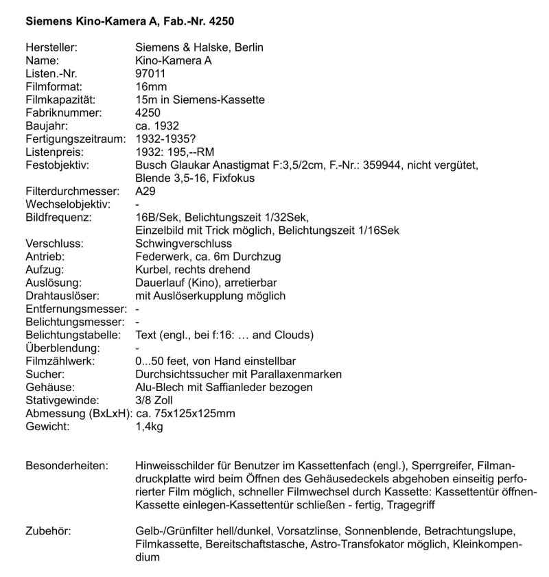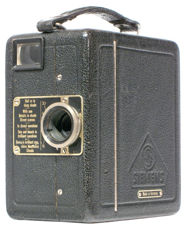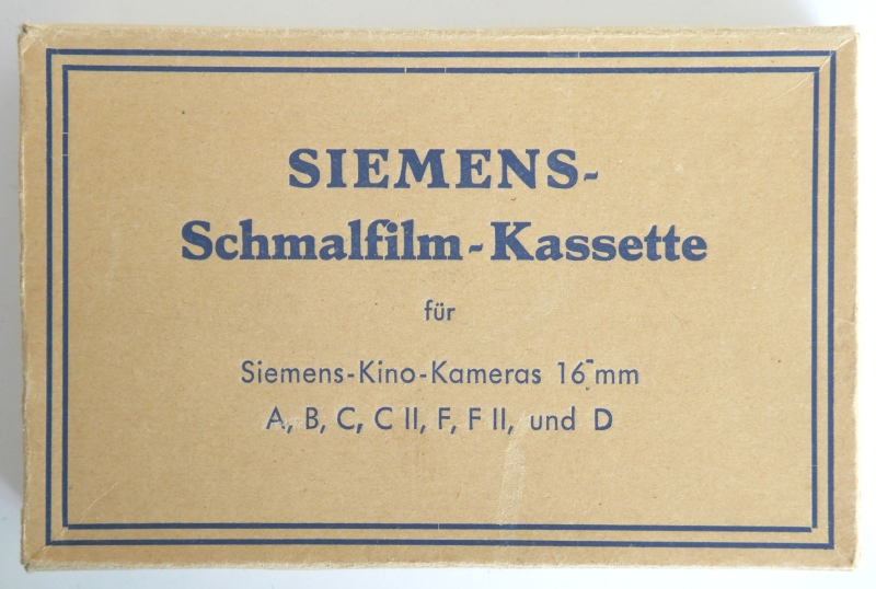 Das Filmen plötzlich einfach geworden: Klappe auf, Filmkassette rein, Klappe zu, Filmen! Die Siemens Kino-Kamera A machte es möglich. Eine würfelförmige Filmbox aus Alu-Blech mit schwarzem Saffianleder bezogen, minimal ausgestattet: Federwerk für 6m Durchzug, Bildfrequenz 16B/Sek, Fixfokus-Objektiv, Belichtungshinweise und Durchsichtssucher. Einfach in der Bedienung, getreu dem Werbespruch ´Gehen, Sehen, Drehen´.
