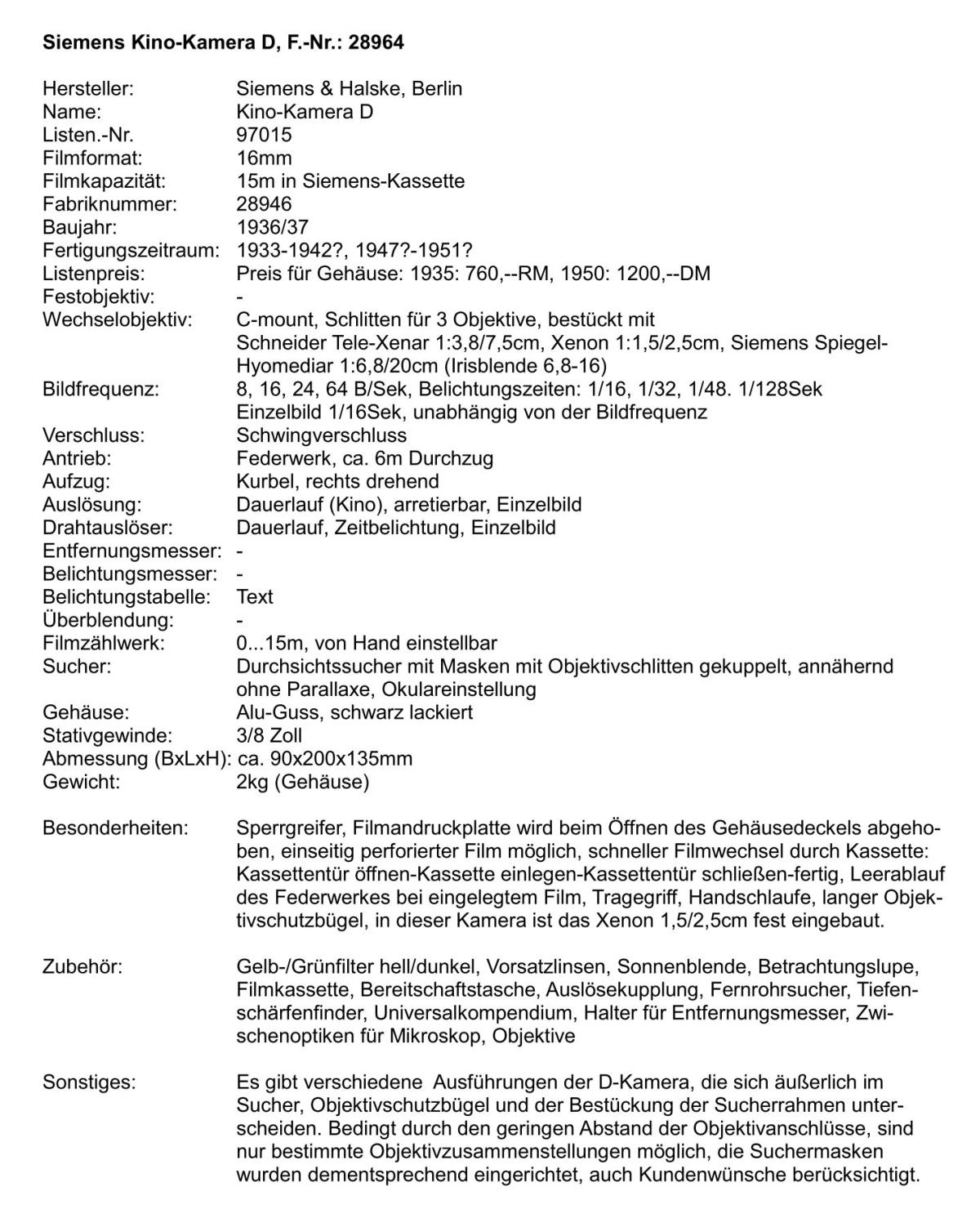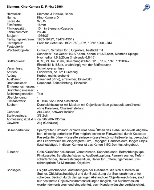 Die Umstände wie aus der vorgenannten Kino-Kamera C ein Typ D wurde, sind heute wohl nicht mehr zu ermitteln, das Ergebnis ist jedoch eine faszinierende Kamera. Laut Prospekt in ´Tropenausführung´ und für große Aufgaben geschaffen´, wie z.B. für die Deutsche Himalaja-Expedition 1934. In der Fachzeitschrift ´Kinotechnik ‘vom Januar 1935 steht dazu unter ´Verschiedene Meldungen´ über die Siemens D: