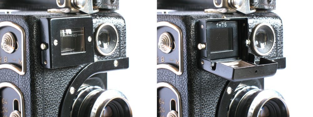Der Durchsichtssucher wurde für eine Brennweite von 7,5cm ausgelegt und war mit einem Rahmen versehen, der Suchervorschaltlinsen für die Brennweiten 1,6, 2,5, 5, 10, 15 und 20cm aufnahm. Eine Vorschaltlinse konnte immer vor dem Sucher bleiben und beim Objektivwechsel abgeklappt werden.