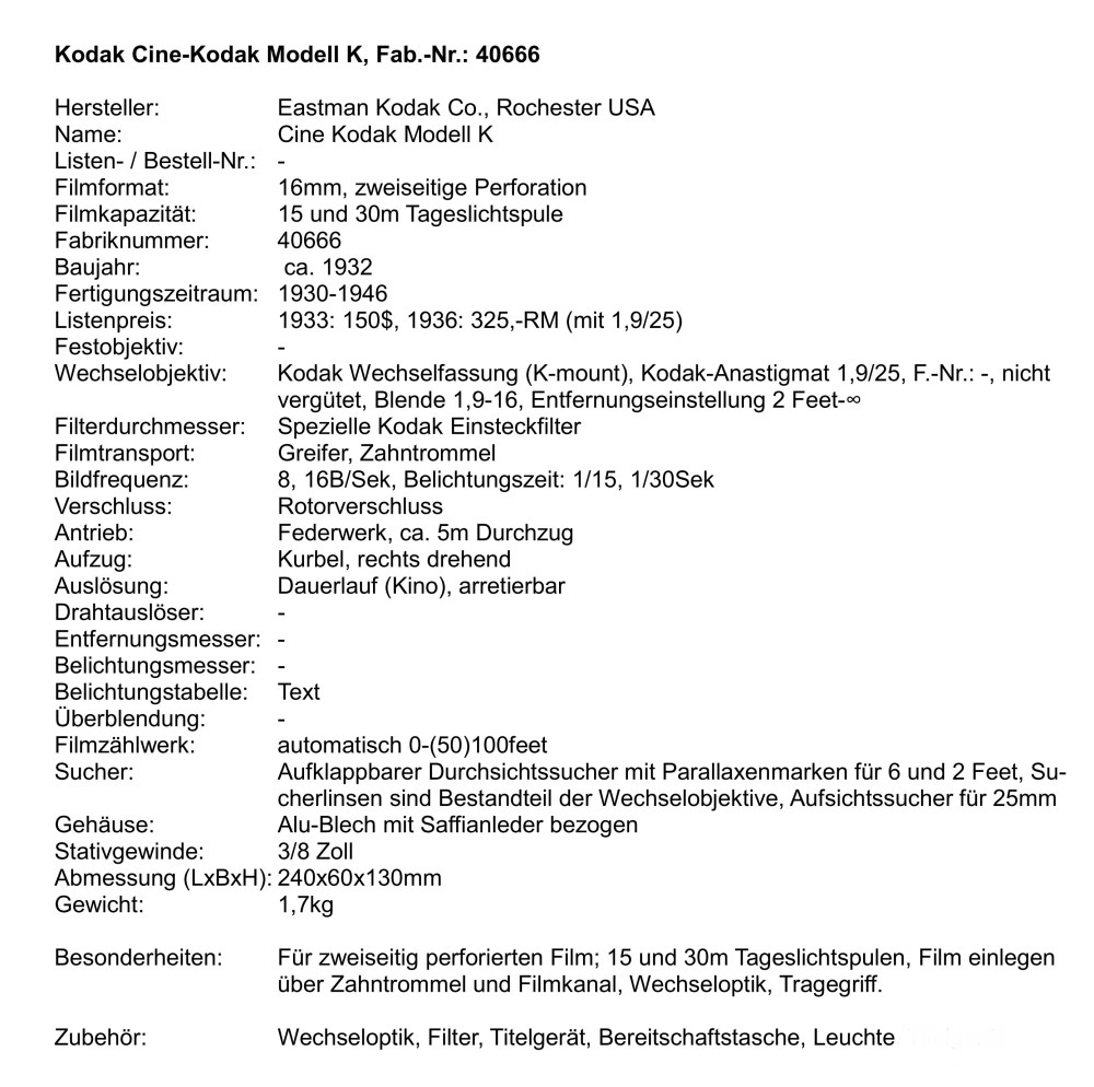 Sie ist kleiner als die klobige B, ist für 15 bzw. 30m-Filmspulen geeignet und hat Wechseloptik. Die Normalbestückung ist ein 1,9/25 oder 3,5/25mm. Die Bildfrequenz von 16B/Sek kann auf Knopfdruck auf 8B/Sek verringert werden. Wie einige andere Kodak-Modelle, ist die Cine-Kodak K auch in anderen Lederfarben als schwarz erhältlich gewesen, sogar exklusiv in Straußenleder. Die K war mit einigen Modifikationen von 1930 bis 1946 im Lieferprogramm.