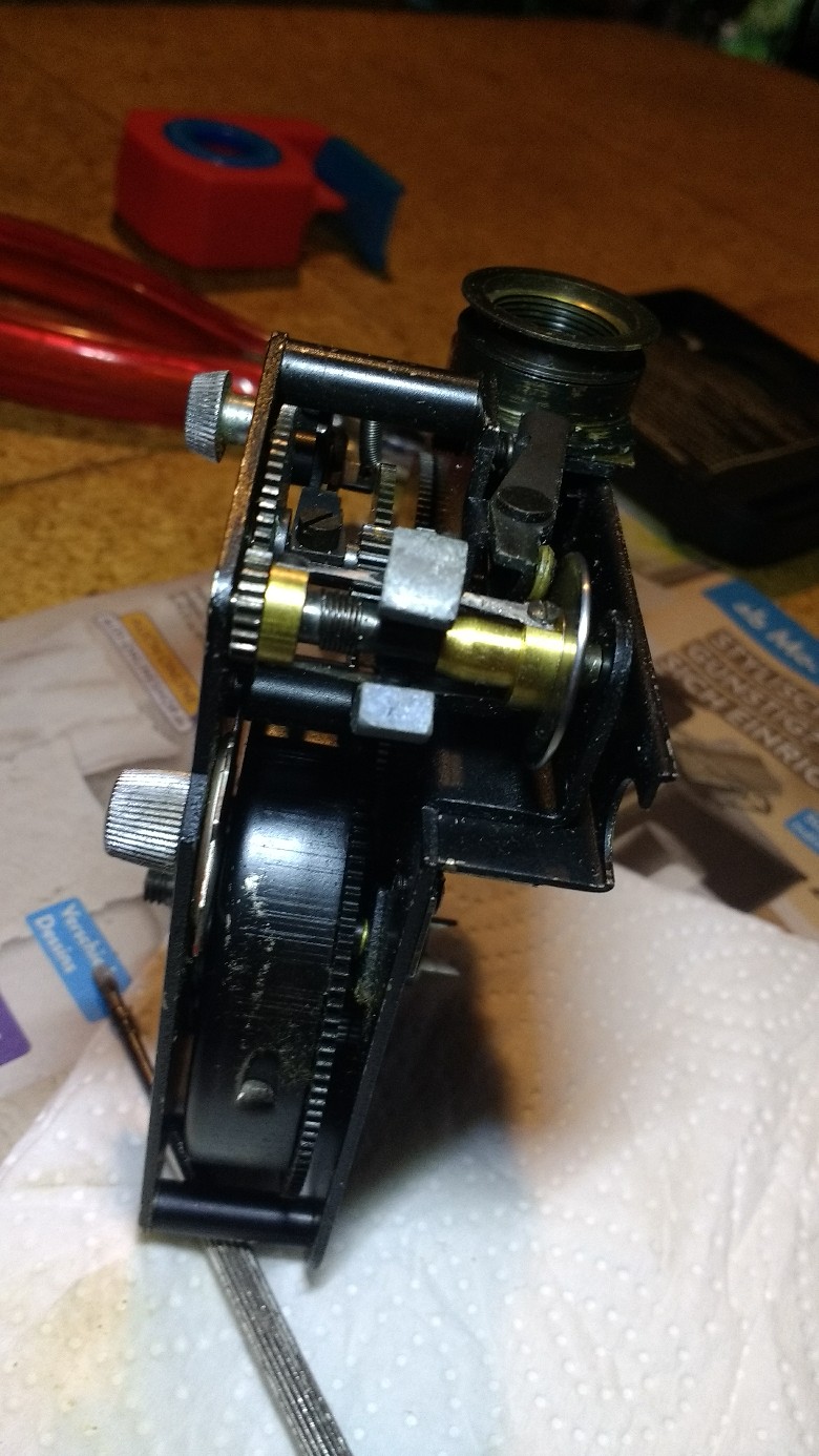Hallo Rainer, da gehören ja solche Filmkassetten hinein - kann es sein dass es ohne nicht zuverlässig funktioniert? Da sind 2 kleine Transporthebelchen, habe daran etwas herum gefummelt, lief aber trotzdem nicht weiter...