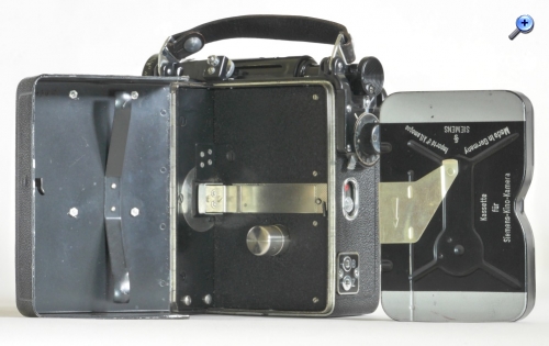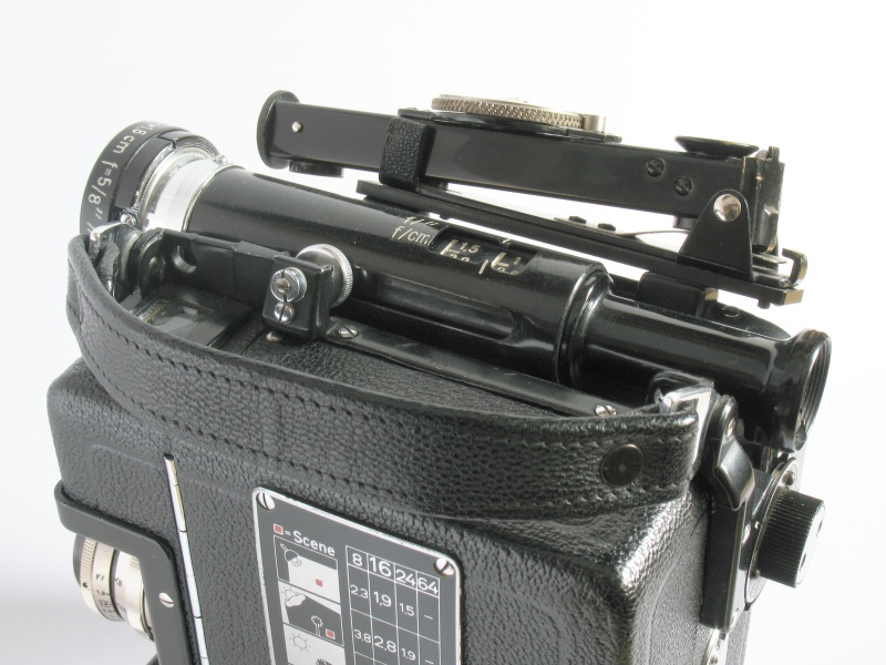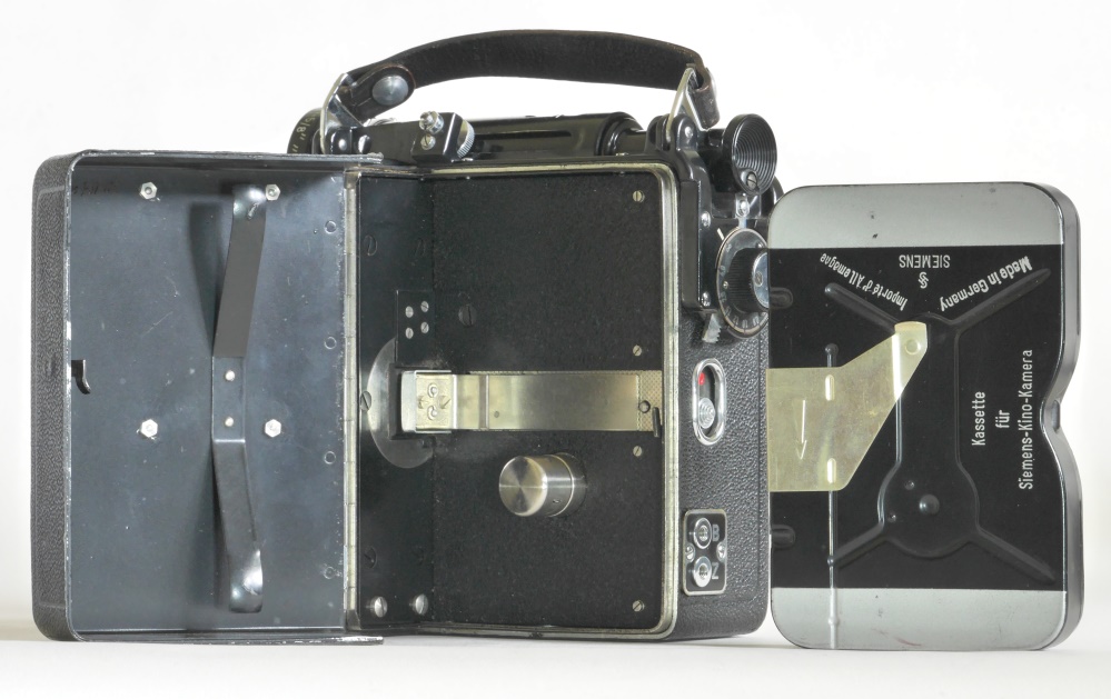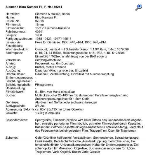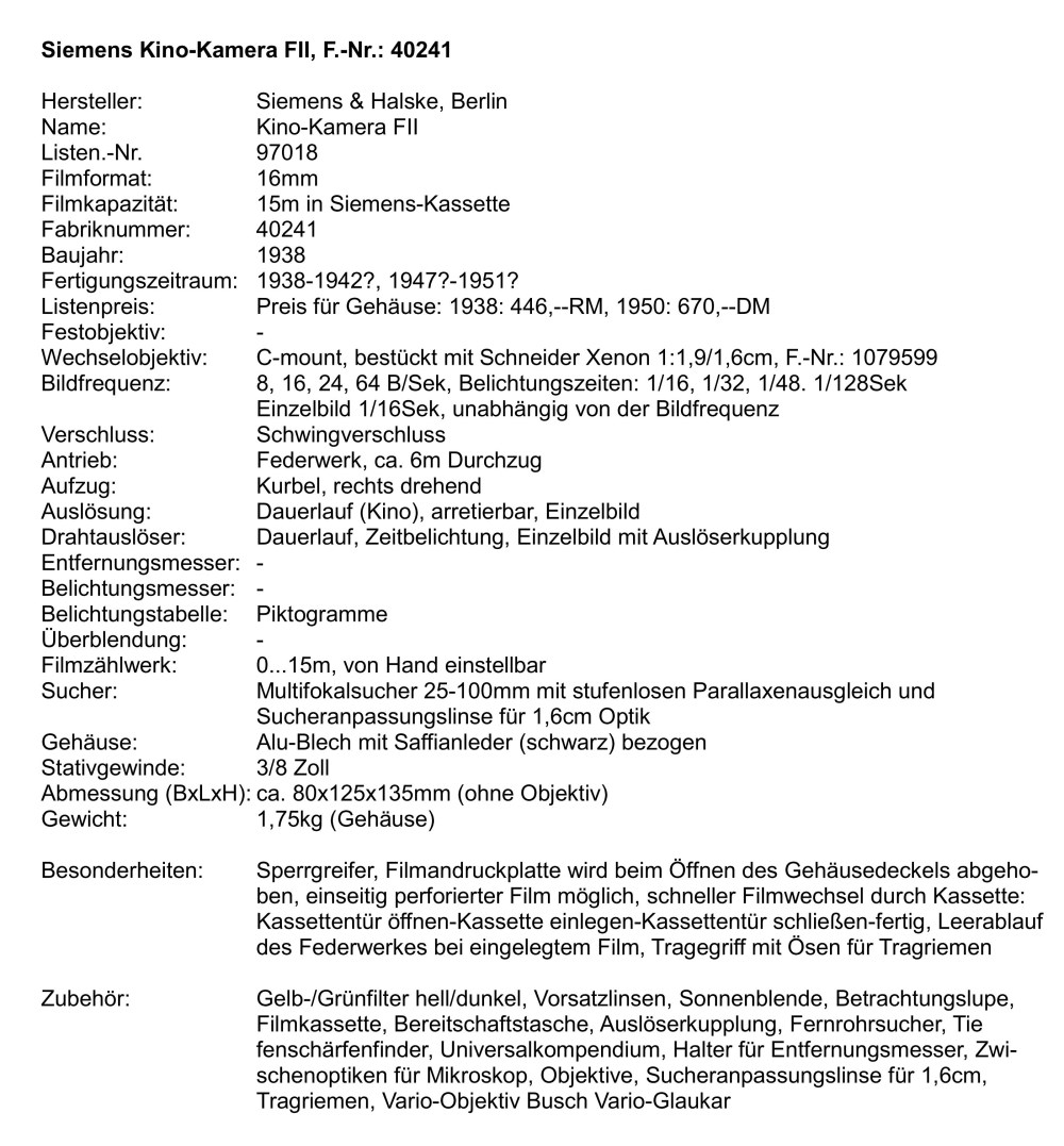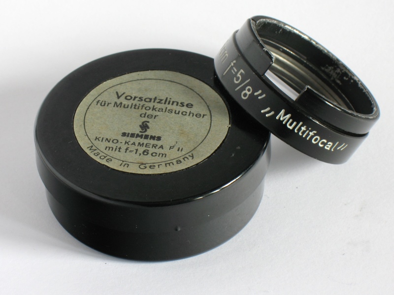 1938 zur Leipziger Frühjahrsmesse bekam auch die Siemens Kino-Kamera F einen Nachfolger, die FII. Neu war der Multifokalsucher, stufenlos einstellbar von 2,5 bis 10cm sowie mit Parallaxenausgleich zwischen 0,5m und ∞. Im Übrigen entsprach die FII dem Vorgängermodell F.