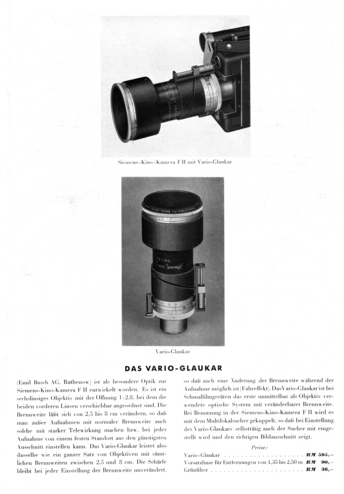 Es war die erste Filmkamera, die mit einem echten Vario-Objektiv bestückt werden konnte, dem Vario-Glaukar 1:2,8/2,5-8m der Firma Emil Busch/Rathenow. Das Objektiv wurde mit einer Kupplungsbrücke mit dem Multifokalsucher verbunden, der dadurch entsprechend der Brennweite eingestellt wurde, der Parallaxenausgleich blieb dabei erhalten. Das Varioobjektiv konnte jederzeit durch ein anderes Objektiv mit dem universellen C-mount Anschluss ersetzt werden. Die Preise 1938: Das Kameragehäuse 446,-RM, das Busch Vario-Glaukar: 595,-RM!
